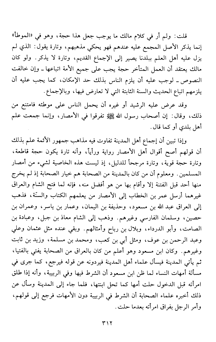 قلت: ولم أر في كلام مالك ما يوجب جعل هذا حجة، وهو في "الموطأ" إنما يذكر الأصل المجمع عليه عندهم فهو يحكي مذهبهم، وتارة يقول: الذي لم يزل عليه أهل العلم ببلدنا يصير إلى الإجماع القديم، وتارة لا يذكر. ولو كان مالك يعتقد أن العمل المتأخر حجة يجب على جميع الأمة اتباعها- وإن خالفت النصوص- لوجب عليه أن يلزم الناس بذلك حد الإمكان، كما يجب عليه أن يلزمهم اتباع الحديث والسنة الثابتة التي لا تعارض فيها، وبالإجماع.