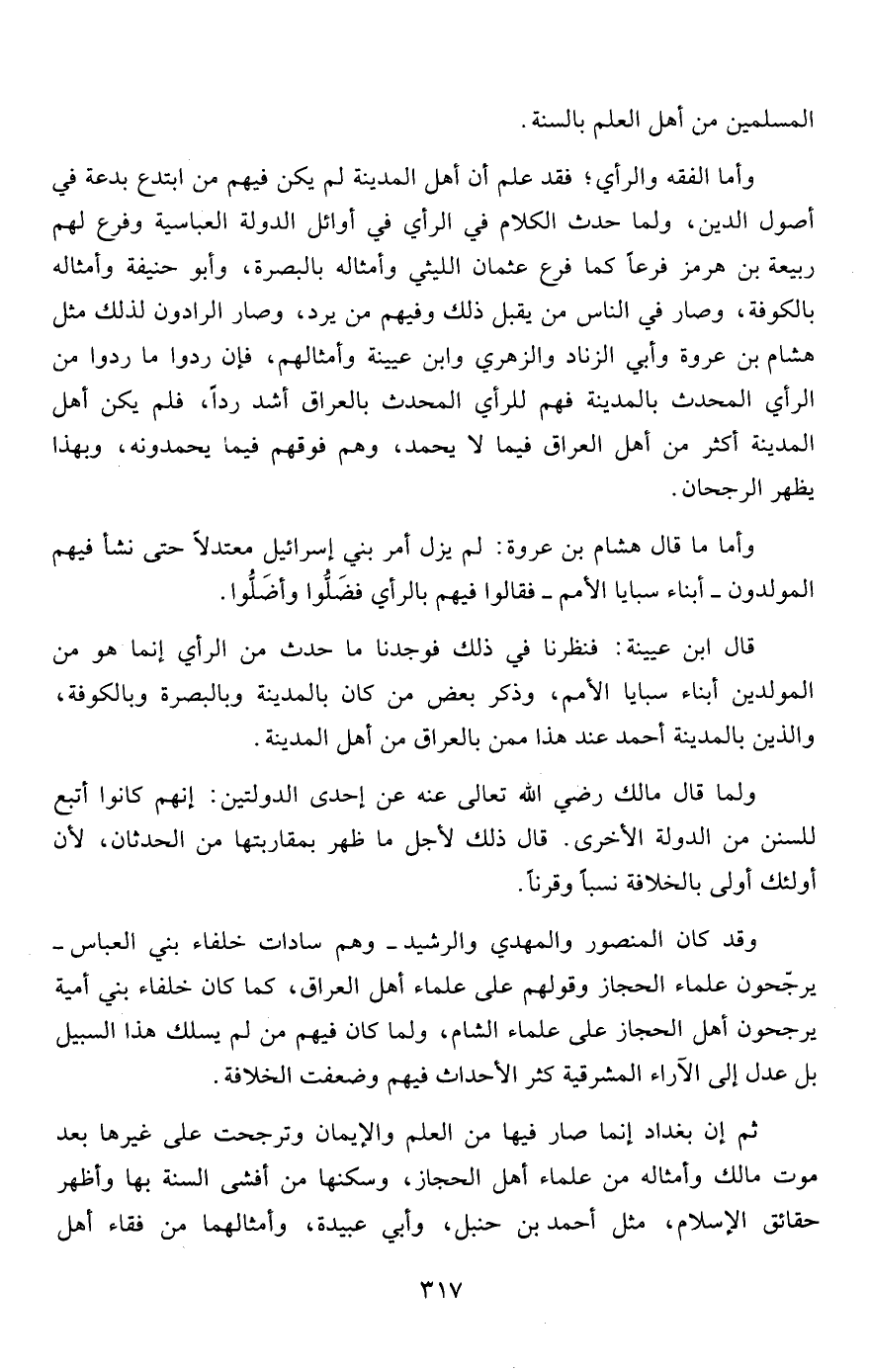 وقد كان المنصور والمهدي والرشيد -وهم سادات خلفاء بني العباس- يرجّحون علماء الحجاز وقولهم على علماء أهل العراق، كما كان خلفاء بني أمية يرجحون أهل الحجاز على علماء الشام، ولما كان فيهم من لم يسلك هذا السبيل بل عدل إلى الآراء المشرقية كثر الأحداث فيهم وضعفت الخلافة.
