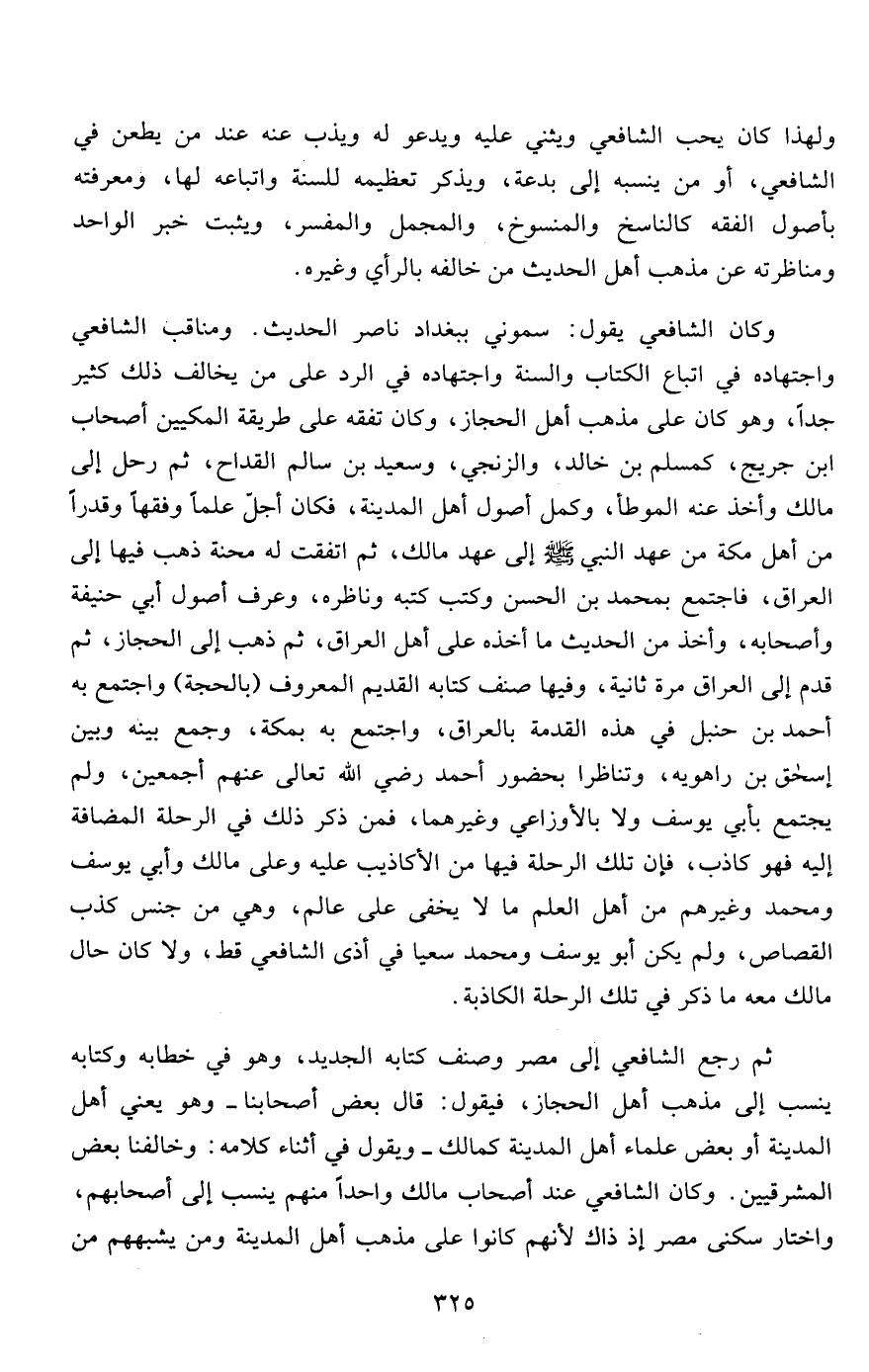 وكان الشافعي يقول: سموني ببغداد ناصر الحديث. ومناقب الشافعي واجتهاده في اتباع الكتاب والسنة واجتهاده في الرد على من يخالف ذلك كثير جداً، وهو كان على مذهب أهل الحجاز، وكان تفقه على طريقة المكيين أصحاب ابن جريج، كمسلم بن خالد، والزنجي، وسعيد بن سالم القداح، ثم رحل إلى مالك وأخذ عنه الموطأ، وكمل أصول أهل المدينة، فكان أجل علماً وفقهاً وقدراً من أهل مكة من عهد النبي صلى الله عليه وسلم إلى عهد مالك، ثم اتفقت له محنة ذهب فيها إلى العراق، فاجتمع بمحمد بن الحسن وكتب كتبه وناظره، وعرف أصول أبي حنيفة وأصحابه، وأخذ من الحديث ما أخذه على أهل العراق، ثم ذهب إلى الحجاز، ثم قدم إلى العراق مرة ثانية، وفيها صنف كتابه القديم المعروف (بالحجة) واجتمع به أحمد بن حنبل في هذه القدمة بالعراق، واجتمع به بمكة، وجمع بينه وبين إسحاق بن راهويه، وتناظرا بحضور أحمد رضي الله تعالى عنهم أجمعين، ولم يجتمع بأبي يوسف ولا بالأوزاعي وغيرهما، فمن ذكر ذلك في الرحلة المضافة إليه فهو كاذب، فإن تلك الرحلة فيها من الأكاذيب عليه وعلى مالك وأبي يوسف ومحمد وغيرهم من أهل العلم ما لا يخفى على عالم، وهي من جنس كذب القصاص، ولم يكن أبو يوسف ومحمد سعيا في أذى الشافعي قط، ولا كان حال مالك معه ما ذكر في تلك الرحلة الكاذبة.