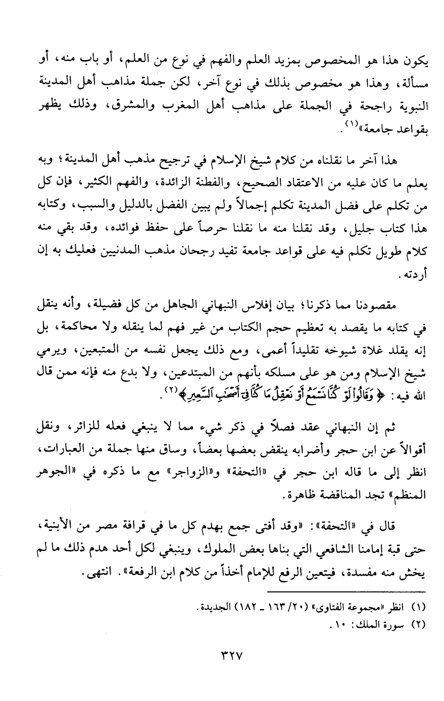 مقصودنا مما ذكرنا؛ بيان إفلاس النبهاني الجاهل من كل فضيلة، وأنه ينقل في كتابه ما يقصد به تعظيم حجم الكتاب من غير فهم لما ينقله ولا محاكمة، بل إنه يقلد غلاة شيوخه تقليداً أعمى، ومع ذلك يجعل نفسه من المتبعين، ويرمي شيخ الإسلام ومن هو على مسلكه بأنهم من المبتدعين، ولا بدع منه فإنه ممن قال الله فيه: {وَقَالُوا لَوْ كُنَّا نَسْمَعُ أَوْ نَعْقِلُ مَا كُنَّا فِي أَصْحَابِ السَّعِيرِ} 2.