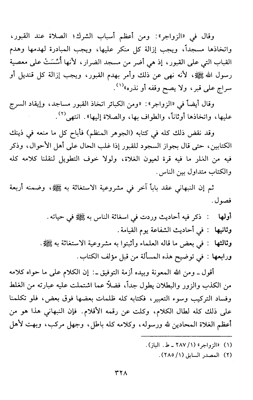أقول- ومن الله المعونة وبيده أزمة التوفيق-: إن الكلام على ما حواه كلامه من الكذب والزور والبطلان يطول جداً، فضلاً عما اشتملت عليه عبارته من الغلط وفساد التركيب وسوء التعبير، فكتابه كله ظلمات بعضها فوق بعض، فلو تكلمنا على ذلك كله لطال الكلام، وكلت عن رقمه الأقلام. فإن النبهاني هذا هو من أعظم الغلاة المحادين لله ورسوله، وكلامه كله باطل، وجهل مركب، وبهت لأهل