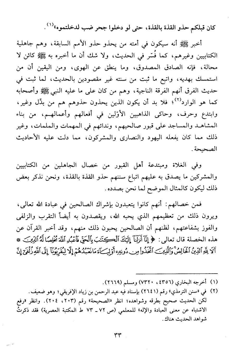 أخبر صلى الله عليه وسلم أنه سيكون في أمته من يحذو حذو الأمم السابقة، وهم جاهلية الكتابيين وغيرهم، كما فُسّر في الحديث، ولا شك أن ما أخبره به صلى الله عليه وسلم كائن لا محالة، فإنه الصادق المصدوق، وما ينطق عن الهوى، ومن اليقين أن من استمسك بهديه، واتبع ما ثبت من سنته غير مقصودين بالحديث، لما ثبت في حديث الفرق أنهم الفرقة الناجية، وهم من كان على ما عليه النبي صلى الله عليه وسلم وأصحابه كما هو الوارد2؛ فلا بد أن يكون الذين يحذون حذوهم هم من بدَّل وغير، وابتدع وحرف، وحاكى الذاهبين الأوّلين في أفعالهم وأعمالهم، من بناء المشاهد والمساجد على قبور صالحيهم، وندائهم في المهمات والملمات، وغير ذلك مما كان يفعله اليهود والنصارى والمشركون، مما دلت عليه الأحاديث الصحيحة.