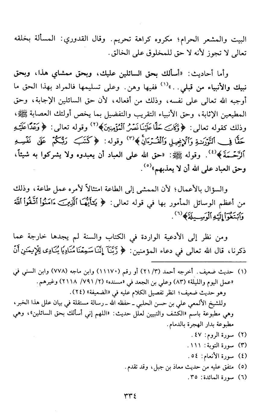 وأما أحاديث: "أسألك بحق السائلين عليك، وبحق ممشاي هذا، وبحق نبيك والأنبياء من قبلي.." 1 ففيها وهن. وعلى تسليمها فالمراد بهذا الحق ما أوجبه الله تعالى على نفسه، وذلك من أفعاله، لأن حق السائلين الإجابة، وحق المطيعين الإثابة، وحق الأنبياء التقريب والتفضيل بما يخص أولئك العصابة صلى الله عليه وسلم، وذلك كقوله تعالى: {وَكَانَ حَقّاً عَلَيْنَا نَصْرُ الْمُؤْمِنِينَ} 2 وقوله تعالى: {وَعْداً عَلَيْهِ حَقّاً فِي التَّوْرَاةِ وَالْأِنْجِيلِ وَالْقُرْآنِ} 3 وقوله: {كَتَبَ رَبُّكُمْ عَلَى نَفْسِهِ الرَّحْمَةَ} 4. وقوله صلى الله عليه وسلم: "حق الله على العباد أن يعبدوه ولا يشركوا به شيئاً، وحق العباد على الله أن لا يعذبهم"5.