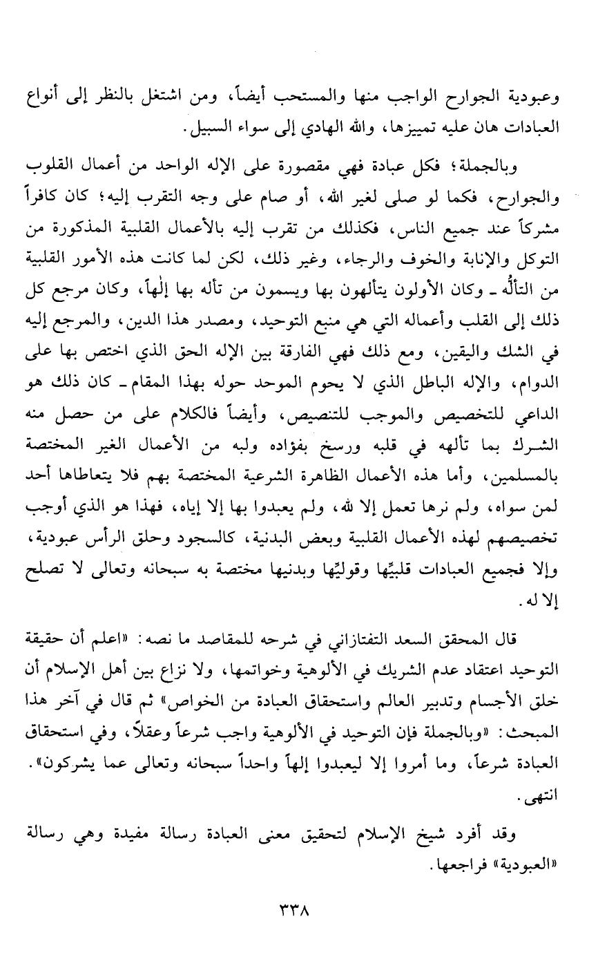 قال المحقق السعد التفتازاني في شرحه للمقاصد ما نصه: "اعلم أن حقيقة التوحيد اعتقاد عدم الشريك في الألوهية وخواتمها، ولا نزاع بين أهل الإسلام أن خلق الأجسام وتدبير العالم واستحقاق العبادة من الخواص" ثم قال في آخر هذا المبحث: "وبالجملة فإن التوحيد في الألوهية واجب شرعاً وعقلاً، وفي استحقاق العبادة شرعاً، وما أمروا إلا ليعبدوا إلهاً واحداً سبحانه وتعالى عما يشركون". انتهى.