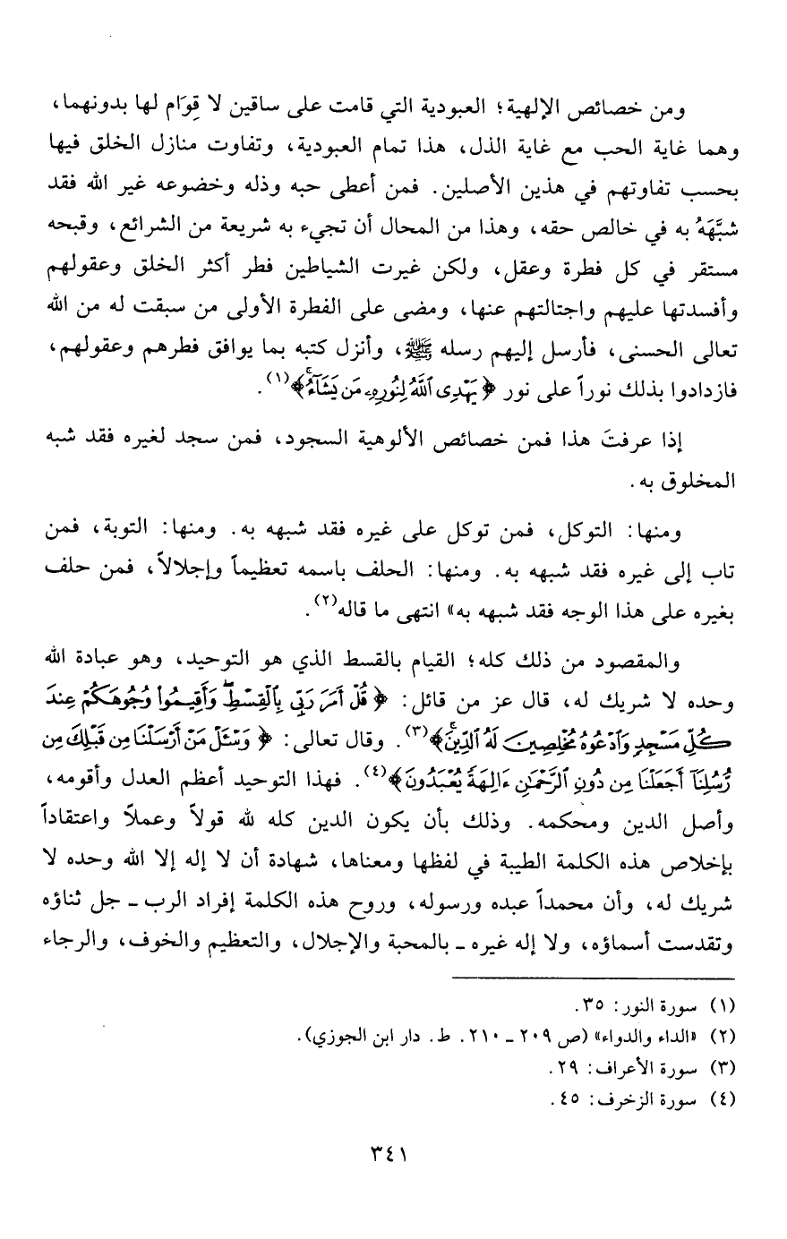 ومن خصائص الإلهية؛ العبودية التي قامت على ساقين لا قِوَام لها بدونهما، وهما غاية الحب مع غاية الذل، هذا تمام العبودية، وتفاوت منازل الخلق فيها بحسب تفاوتهم في هذين الأصلين. فمن أعطى حبه وذله وخضوعه غير الله فقد شَبَّهَهُ به في خالص حقه، وهذا من المجال أن تجيء به شريعة من الشرائع، وقبحه مستقر في كل فطرة وعقل، ولكن غيرت الشياطين فطر أكثر الخلق وعقولهم وأفسدتها عليهم واجتالتهم عنها، ومضى على الفطرة الأولى من سبقت له من الله تعالى الحسنى، فأرسل إليهم رسله صلى الله عليه وسلم، وأنزل كتبه بما يوافق فطرهم وعقولهم، فازدادوا بذلك نوراً على نور {يَهْدِي اللَّهُ لِنُورِهِ مَنْ يَشَاءُ} 1.