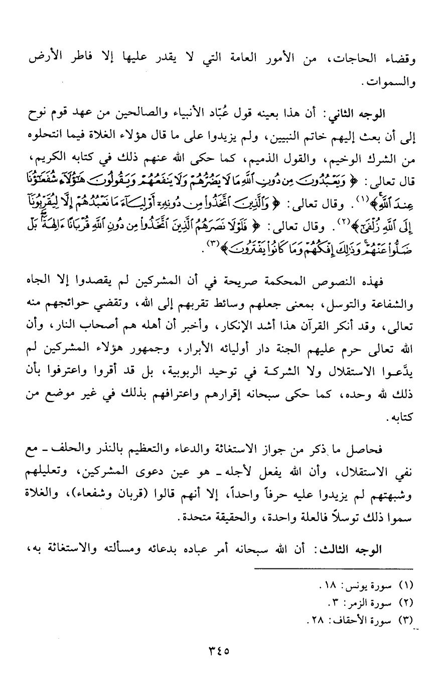 الوجه الثاني: أن هذا بعينه قول عُبّاد الأنبياء والصالحين من عهد قوم نوح إلى أن بعث إليهم خاتم النبيين، ولم يزيدوا على ما قال هؤلاء الغلاة فيما انتحلوه من الشرك الوخيم، والقول الذميم، كما حكى الله عنهم ذلك في كتابه الكريم، قال تعالى: {وَيَعْبُدُونَ مِنْ دُونِ اللَّهِ مَا لا يَضُرُّهُمْ وَلا يَنْفَعُهُمْ وَيَقُولُونَ هَؤُلاءِ شُفَعَاؤُنَا عِنْدَ اللَّهِ} 1. وقال تعالى: {وَالَّذِينَ اتَّخَذُوا مِنْ دُونِهِ أَوْلِيَاءَ مَا نَعْبُدُهُمْ إِلَّا لِيُقَرِّبُونَا إِلَى اللَّهِ زُلْفَى} 2. وقال تعالى: {فَلَوْلا نَصَرَهُمُ الَّذِينَ اتَّخَذُوا مِنْ دُونِ اللَّهِ قُرْبَاناً آلِهَةً بَلْ ضَلُّوا عَنْهُمْ وَذَلِكَ إِفْكُهُمْ وَمَا كَانُوا يَفْتَرُونَ} 3.