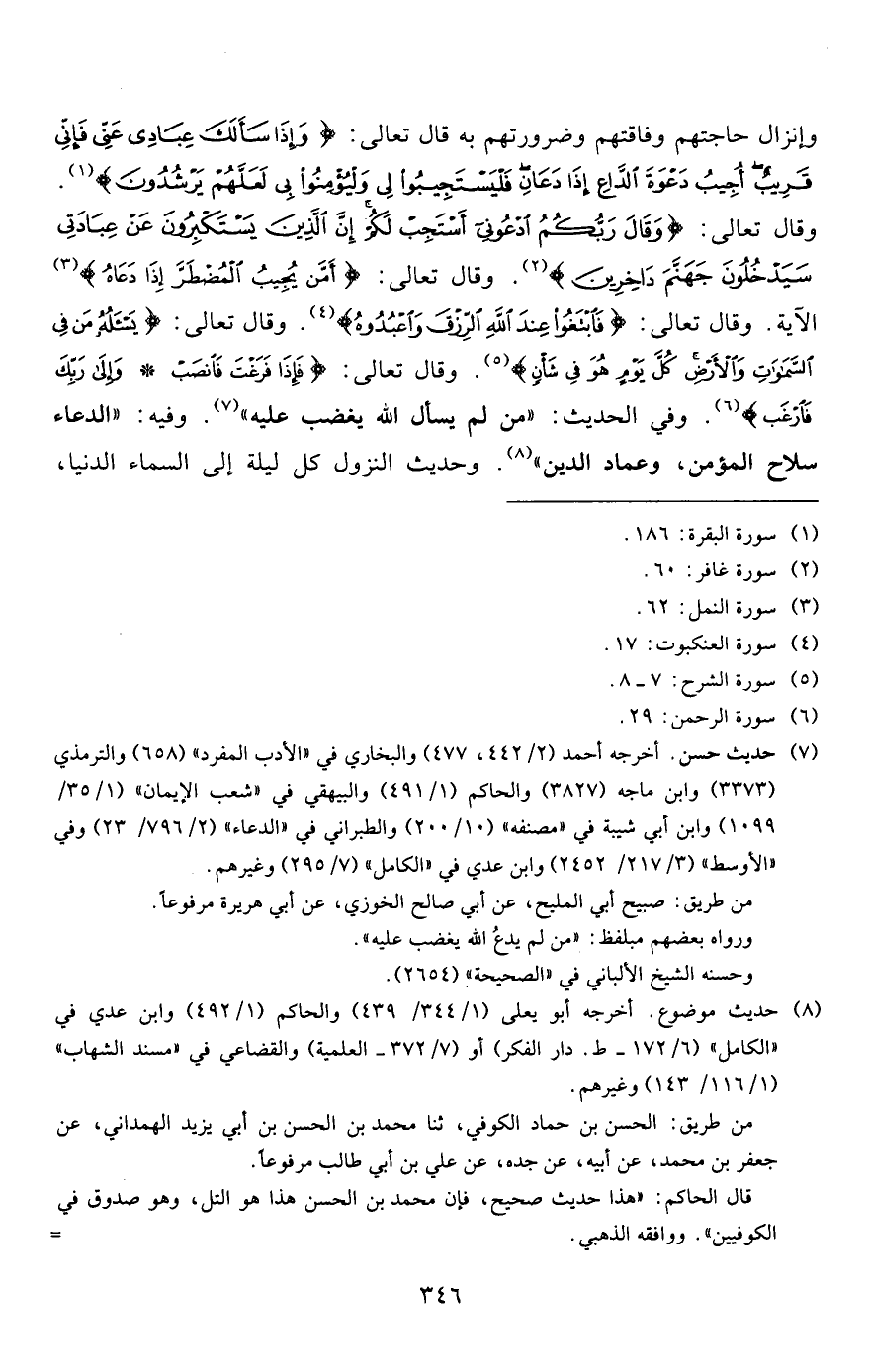 وإنزال حاجتهم وفاقتهم وضرورتهم به قال تعالى: {وَإِذَا سَأَلَكَ عِبَادِي عَنِّي فَإِنِّي قَرِيبٌ أُجِيبُ دَعْوَةَ الدَّاعِ إِذَا دَعَانِ فَلْيَسْتَجِيبُوا لِي وَلْيُؤْمِنُوا بِي لَعَلَّهُمْ يَرْشُدُونَ} 1. وقال تعالى: {وَقَالَ رَبُّكُمُ ادْعُونِي أَسْتَجِبْ لَكُمْ إِنَّ الَّذِينَ يَسْتَكْبِرُونَ عَنْ عِبَادَتِي سَيَدْخُلُونَ جَهَنَّمَ دَاخِرِينَ} 2. وقال تعالى: {أَمَّنْ يُجِيبُ الْمُضْطَرَّ إِذَا دَعَاهُ} 3 الآية. وقال تعالى: {فَابْتَغُوا عِنْدَ اللَّهِ الرِّزْقَ وَاعْبُدُوهُ} 4. وقال تعالى: {يَسْأَلُهُ مَنْ فِي السَّمَاوَاتِ وَالْأَرْضِ كُلَّ يَوْمٍ هُوَ فِي شَأْنٍ} 5. وقال تعالى: {فَإِذَا فَرَغْتَ فَانْصَبْ * َإِلَى رَبِّكَ فَارْغَبْ} 6. وفي الحديث: "من لم يسأل الله يغضب عليه"7. وفيه: "الدعاء سلاح المؤمن، وعماد الدين"8. وحديث النزول كل ليلة إلى السماء الدنيا،