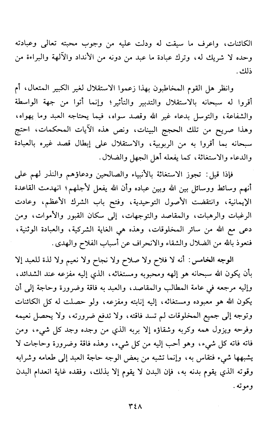 الوجه الخامس: أنه لا فلاح ولا صلاح ولا نجاح ولا نعيم ولا لذة للعبد إلا بأن يكون الله سبحانه هو إلهه ومحبوبه ومستغاثه، الذي إليه مفزعه عند الشدائد، وإليه مرجعه في عامة المطالب والمقاصد، والعبد به فاقة وضرورة وحاجة إلى أن يكون الله هو معبوده ومستغاثه، إليه إنابته ومفزعه، ولو حصلت له كل الكائنات وتوجه إلى جميع المخلوقات لم تسد فاقته، ولا تدفع ضرورته، ولا يحصل نعيمه وفرحه ويزول همه وكربه وشقاؤه إلا بربه الذي من وجده وجد كل شيء، ومن فاته فاته كل شيء، وهو أجب إليه من كل شيء، وهذه فاقة وضرورة وحاجات لا يشبهها شيء فتقاس به، وإنما تشبه من بعض الوجه حاجة العبد إلى طعامه وشرابه وقوته الذي يقوم بدنه به، فإن البدن لا يقوم إلا بذلك، وفقده غاية انعدام البدن وموته.