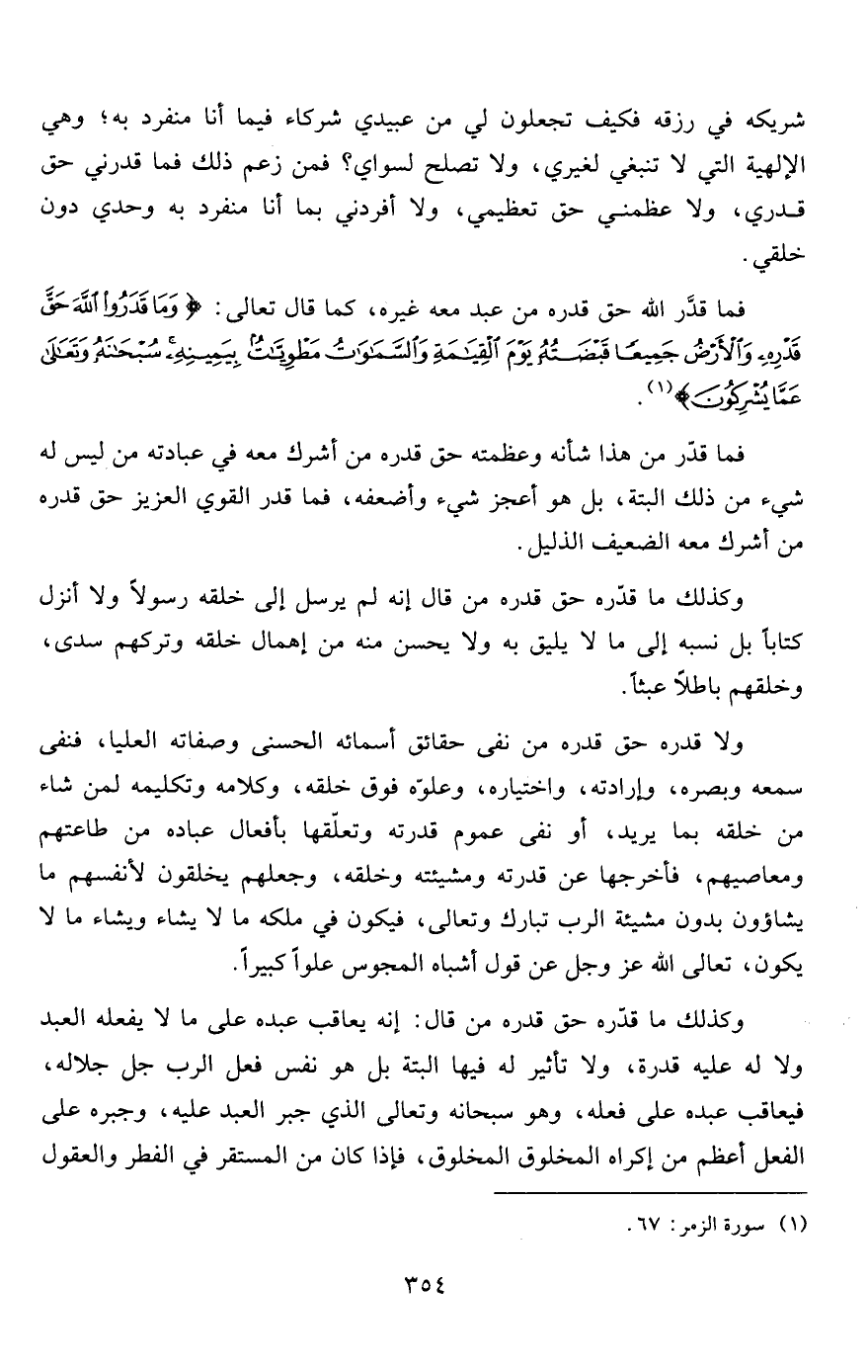 ولا قدره حق قدره من نفى حقائق أسمائه الحسنى وصفاته العليا، فنفى سمعه وبصره، وإرادته، واختياره، وعلوّه فوق خلقه، وكلامه وتكليمه لمن شاء من خلقه بما يريد، أو نفى عموم قدرته وتعلّقها بأفعال عباده من طاعتهم ومعاصيهم، فأخرجها عن قدرته ومشيئته وخلقه، وجعلهم يخلقون لأنفسهم ما يشاؤون بدون مشيئة الرب تبارك وتعالى، فيكون في ملكه ما لا يشاء ويشاء ما لا يكون، تعالى الله عز وجل عن قول أشباه المجوس علواً كبيراً.