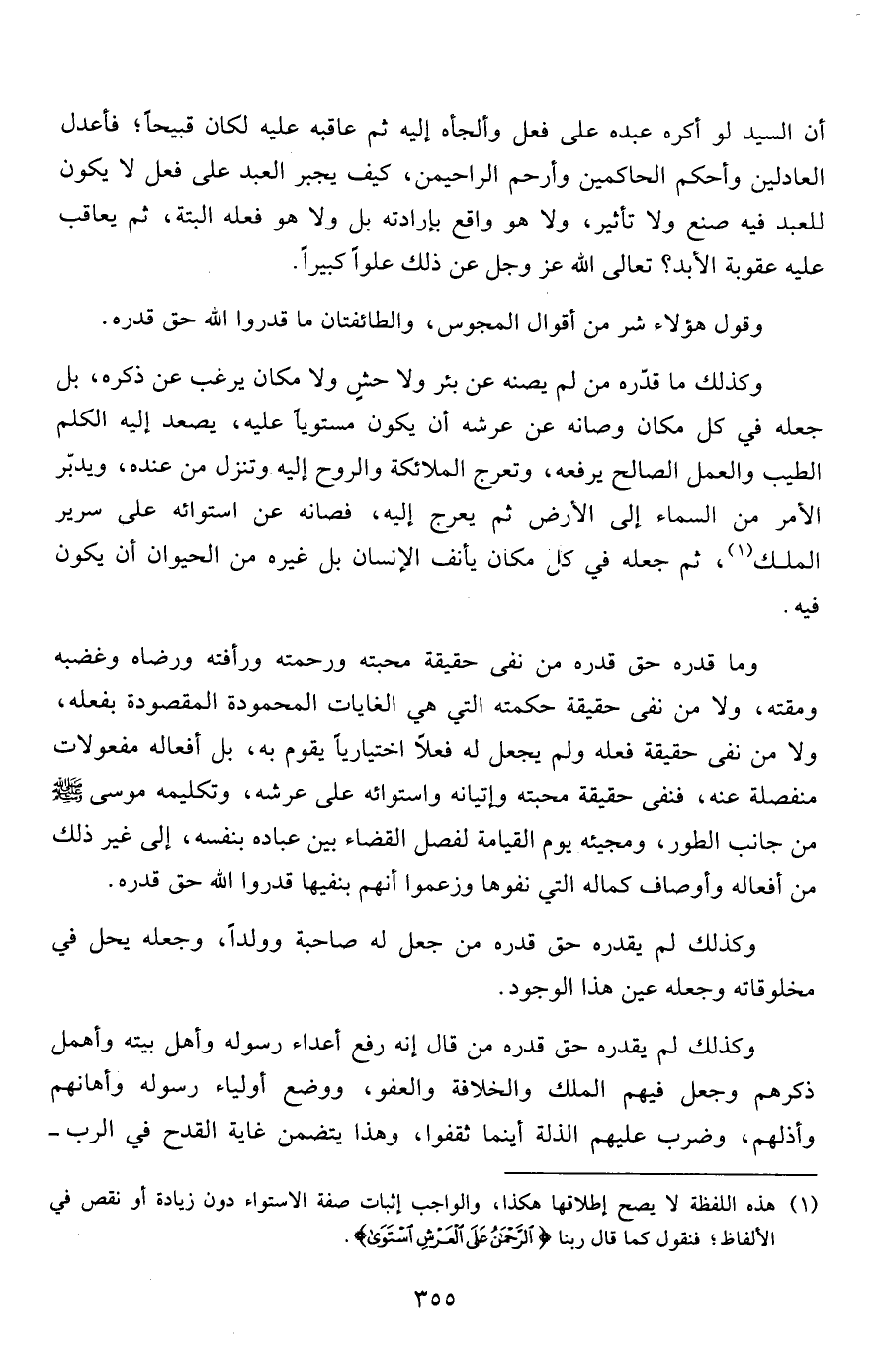 وما قدره حق قدره من نفى حقيقة محبته ورحمته ورأفته ورضاه وغضبه ومقته، ولا من نفى حقيقة حكمته التي هي الغايات المحمودة المقصودة بفعله، ولا من نفى حقيقة فعله ولم يجعل له فعلاً اختيارياً يقوم به، بل أفعاله مفعولات منفصلة عنه، فنفى حقيقة محبته وإتيانه واستوائه على عرشه، وتكليمه موسى عليه السلام من جانب الطور، ومجيئه يوم القيامة لفصل القضاء بين عباده بنفسه، إلى غير ذلك من أفعاله وأوصاف كماله التي نفوها وزعموا أنهم بنفيها قدروا الله حق قدره.