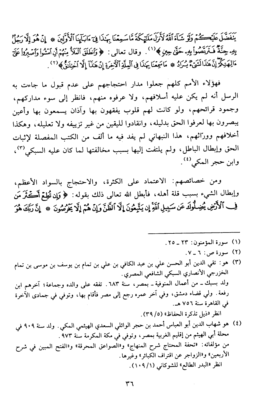 فهؤلاء الأمم كلهم جعلوا مدار احتجاجهم على عدم قبول ما جاءت به الرسل أنه لم يكن عليه أسلافهم، ولا عرفوه منهم، فانظر إلى سوء مداركهم، وجمود قرائحهم، ولو كانت لهم قلوب يفقهون بها وآذان يسمعون بها وأعين يبصرون بها لعرفوا الحق بدليله، وانقادوا لليقين من غير تزييفه ولا تعليله، وهكذا أخلافهم وورّاثهم، هذا النبهاني لم يفد فيه ما ألف من الكتب المفصلة لإثبات الحق وإبطال الباطل، ولم يلتفت إليها بسبب مخالفتها لما كان عليه السبكي3، وابن حجر المكي4.