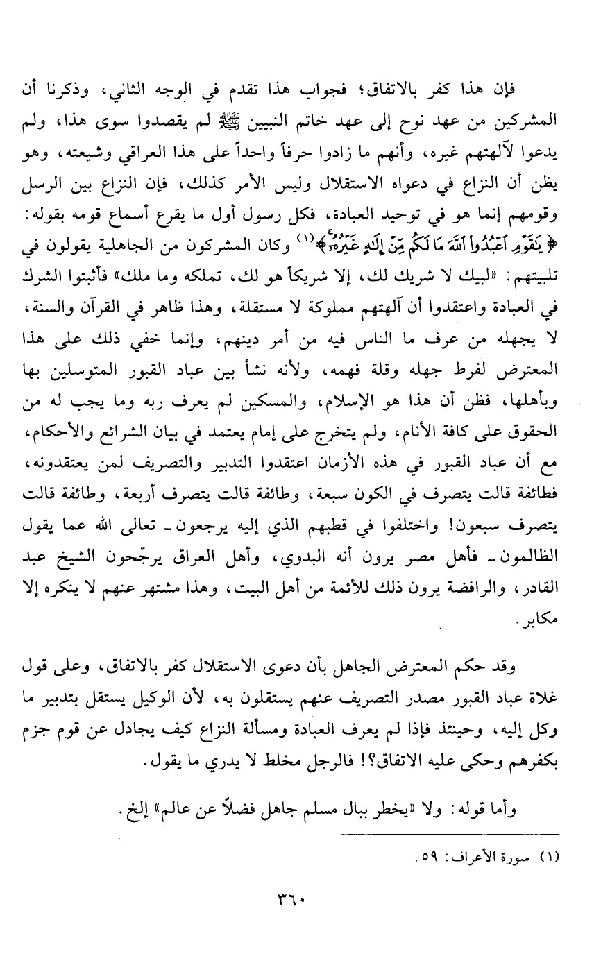 فإن هذا كفر بالاتفاق؛ فجواب هذا تقدم في الوجه الثاني، وذكرنا أن المشركين من عهد نوح إلى عهد خاتم النبيين صلى الله عليه وسلم لم يقصدوا سوى هذا، ولم يدعوا لآلهتهم غيره، وأنهم ما زادوا حرفاً واحداً على هذا العراقي وشيعته، وهو يظن أن النزاع في دعواه الاستقلال وليس الأمر كذلك، فإن النزاع بين الرسل وقومهم إنما هو في توحيد العبادة، فكل رسول أول ما يقرع أسماع قومه بقوله: {يَا قَوْمِ اعْبُدُوا اللَّهَ مَا لَكُمْ مِنْ إِلَهٍ غَيْرُهُ} 1 وكان المشركون من الجاهلية يقولون في تلبيتهم: "لبيك لا شريك لك، إلا شريكاً هو لك، تملكه وما ملك" فأثبتوا الشرك في العبادة واعتقدوا أن آلهتهم مملوكة لا مستقلة، وهذا ظاهر في القرآن والسنة، لا يجهله من عرف ما الناس فيه من أمر دينهم، وإنما خفي ذلك على هذا المعترض لفرط جهله وقلة فهمه، ولأنه نشأ بين عباد القبور المتوسلين بها وبأهلها، فظن أن هذا هو الإسلام، والمسكين لم يعرف ربه وما يجب له من الحقوق على كافة الأنام، ولم يتخرج على إمام يعتمد في بيان الشرائع والأحكام، مع أن عباد القبور في هذه الأزمان اعتقدوا التدبير والتصريف لمن يعتقدونه، فطائفة قالت يتصرف في الكون سبعة، وطائفة قالت يتصرف أربعة، وطائفة قالت يتصرف سبعون! واختلفوا في قطبهم الذي إليه يرجعون- تعالى الله عما يقول الظالمون- فأهل مصر يرون أنه البدوي، وأهل العراق يرجّحون الشيخ عبد القادر، والرافضة يرون ذلك للأئمة من أهل البيت، وهذا مشتهر عنهم لا ينكره إلا مكابر.