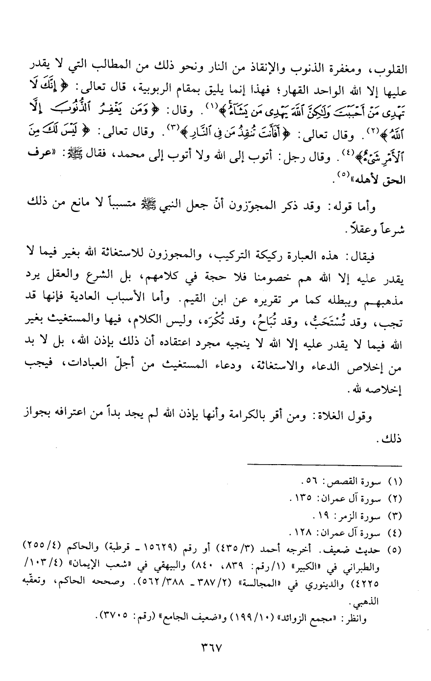 القلوب، ومغفرة الذنوب والإنقاذ من النار ونحو ذلك من المطالب التي لا يقدر عليها إلا الله الواحد القهار؛ فهذا إنما يليق بمقام الربوبية، قال تعالى: {إِنَّكَ لا تَهْدِي مَنْ أَحْبَبْتَ وَلَكِنَّ اللَّهَ يَهْدِي مَنْ يَشَاءُ} 1. وقال: {وَمَنْ يَغْفِرُ الذُّنُوبَ إِلَّا اللَّهُ} 2. وقال تعالى: {أَفَأَنْتَ تُنْقِذُ مَنْ فِي النَّارِ} 3. وقال تعالى: {لَيْسَ لَكَ مِنَ الْأَمْرِ شَيْءٌ} 4. وقال رجل: أتوب إلى الله ولا أتوب إلى محمد، فقال صلى الله عليه وسلم: "عرف الحق لأهله"5.