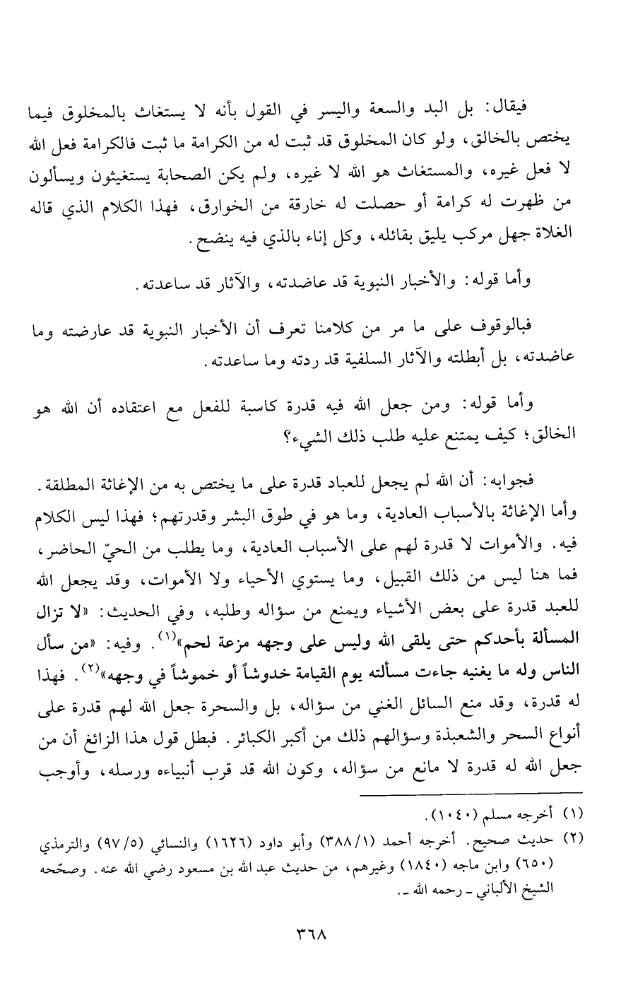 وأما الإغاثة بالأسباب العادية، وما هو في طوق البشر وقدرتهم؛ فهذا ليس الكلام فيه. والأموات لا قدرة لهم على الأسباب العادية، وما يطلب من الحيّ الحاضر، فما هنا ليس من ذلك القبيل، وما يستوي الأحياء ولا الأموات، وقد يجعل الله للعبد قدرة على بعض الأشياء ويمنع من سؤاله وطلبه، وفي الحديث: "لا تزال المسألة بأحدكم حتى يلقى الله وليس على وجهه مزعة لحم"1. وفيه: "من سأل الناس وله ما يغنيه جاءت مسألته يوم القيامة خدوشاً أو خموشاً في وجهه"2. فهذا له قدرة، وقد منع السائل الغني من سؤاله، بل والسحرة جعل الله لهم قدرة على أنواع السحر والشعبذة وسؤالهم ذلك من أكبر الكبائر. فبطل قول هذا الزائغ أن من جعل الله له قدرة لا مانع من سؤاله، وكون الله قده قرب أنبياءه ورسله، وأوجب