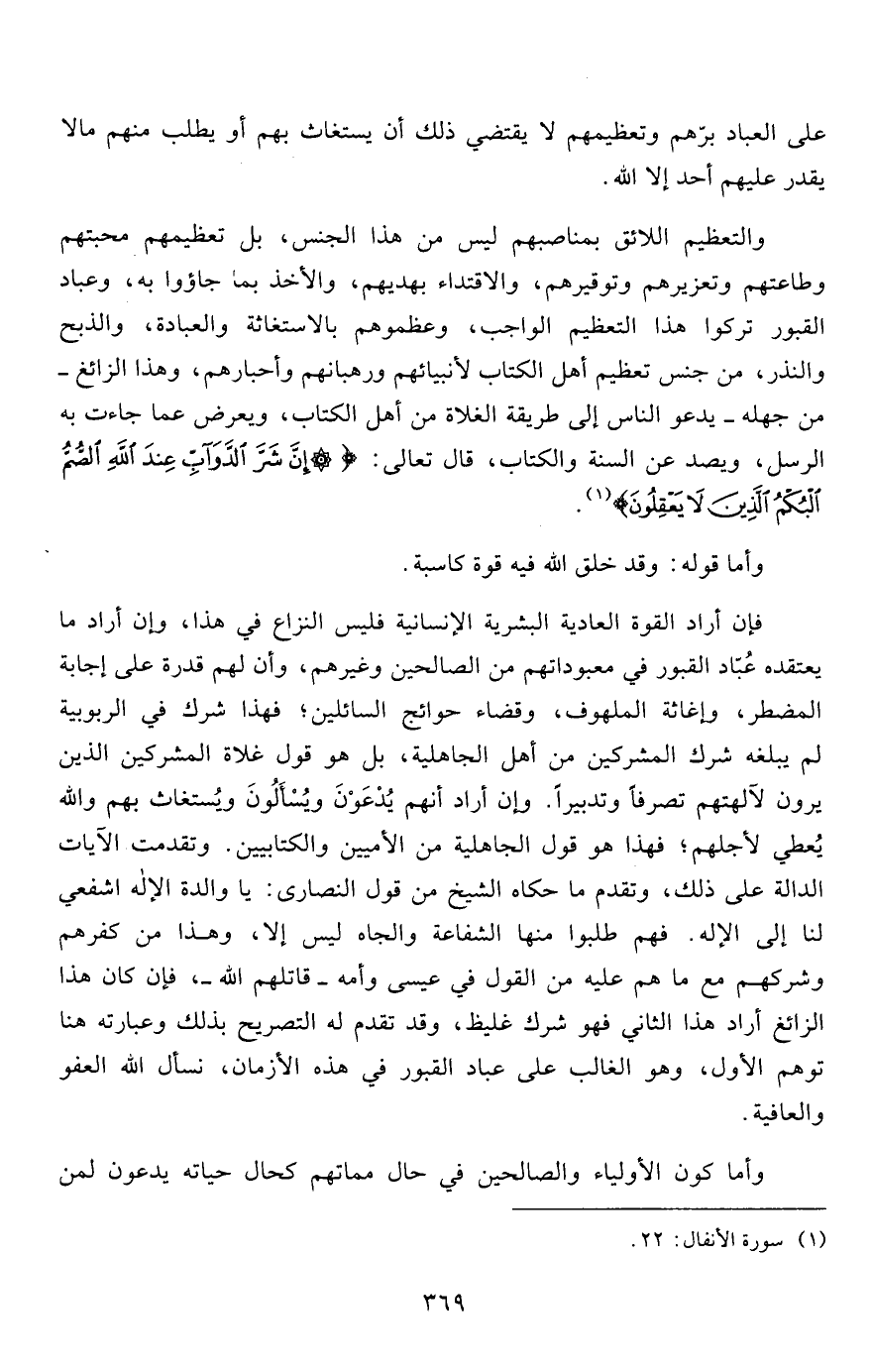 فإن أراد القوة العادية البشرية الإنسانية فليس النزاع في هذا، وإن أراد ما يعتقده عُبّاد القبور في معبوداتهم من الصالحين وغيرهم، وأن لهم قدرة على إجابة المضطر، وإغاثة الملهوف، وقضاء حوائج السائلين؛ فهذا شرك في الربوبية لم يبلغه شرك المشركين من أهل الجاهلية، بل هو قول غلاة المشركين الذين يرون لآلهتهم تصرفاً وتدبيراً. وإن أراد أنهم يُدْعَوْنَ ويُسْأَلُونَ ويُستغاث بهم والله يُعطي لأجلهم؛ فهذا هو قول الجاهلية من الأميين والكتابيين. وتقدمت الآيات الدالة على ذلك، وتقدم ما حكاه الشيخ من قول النصارى: يا والدة الإله اشفعي لنا إلى الإله. فهم طلبوا منها الشفاعة والجاه ليس إلا، وهذا من كفرهم وشركهم مع ما هم عليه من القول في عيسى وأمه- قاتلهم الله-، فإن كان هذا الزائغ أراد هذا الثاني فهو شرك غليظ، وقد تقدم له التصريح بذلك وعبارته هنا توهم الأول، وهو الغالب على عباد القبور في هذه الأزمان، نسأل الله العفو والعافية.