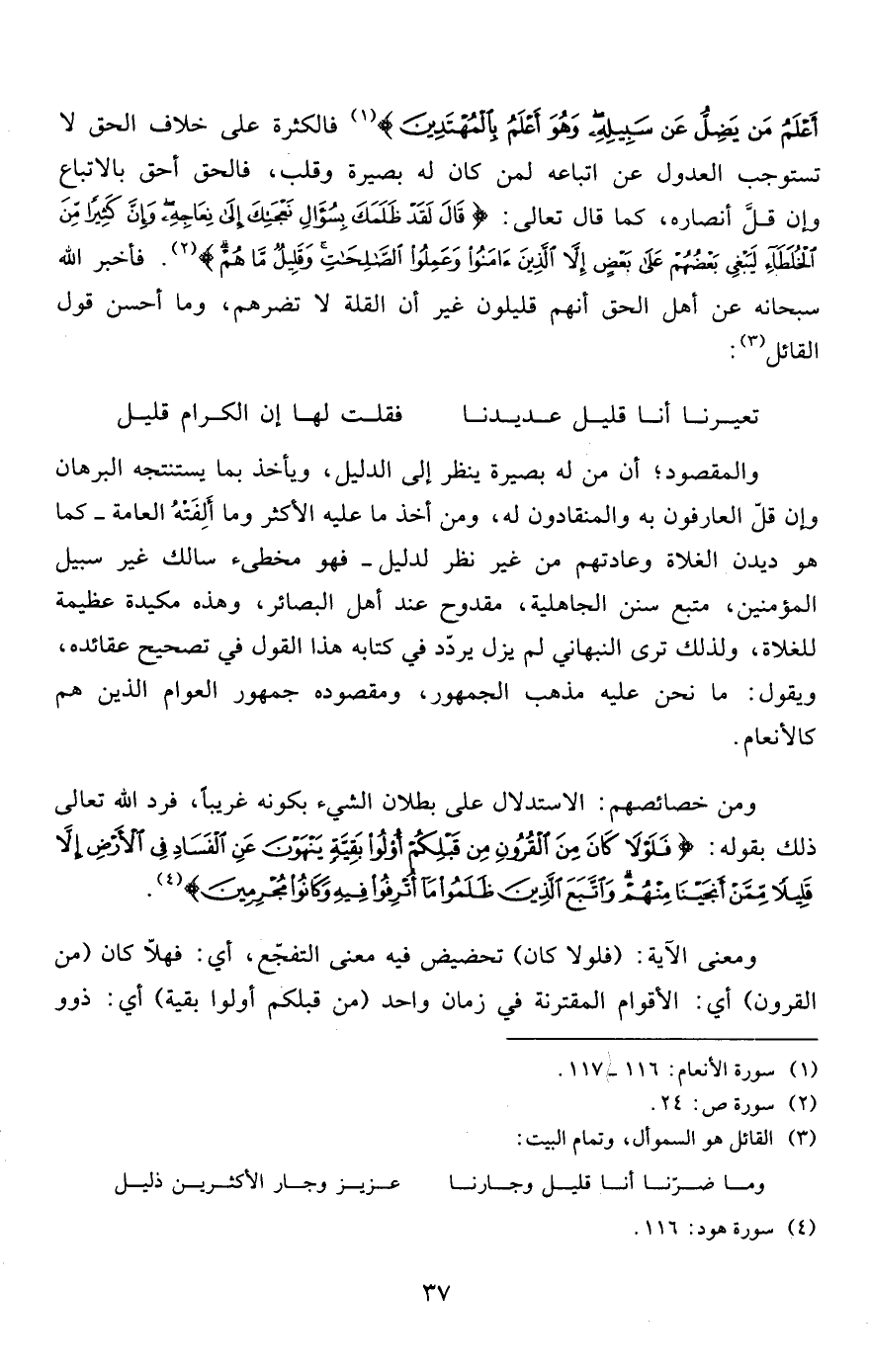 أَعْلَمُ مَنْ يَضِلُّ عَنْ سَبِيلِهِ وَهُوَ أَعْلَمُ بِالْمُهْتَدِينَ} 1 فالكثرة على خلاف الحق لا تستوجب العدول عن اتباعه لمن كان له بصيرة وقلب، فالحق أحق بالاتباع وإن قلَّ أنصاره، كما قال تعالى: {قَالَ لَقَدْ ظَلَمَكَ بِسُؤَالِ نَعْجَتِكَ إِلَى نِعَاجِهِ وَإِنَّ كَثِيراً مِنَ الْخُلَطَاءِ لَيَبْغِي بَعْضُهُمْ عَلَى بَعْضٍ إِلَّا الَّذِينَ آمَنُوا وَعَمِلُوا الصَّالِحَاتِ وَقَلِيلٌ مَا هُمْ} 2. فأخبر الله سبحانه عن أهل الحق أنهم قليلون غير أن القلة لا تضرهم، وما أحسن قول القائل 3:
