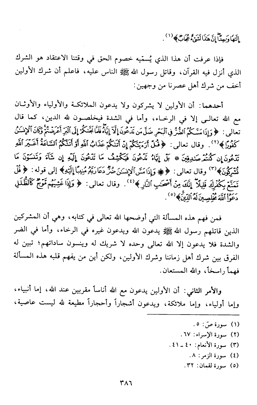 فإذا عرفت أن هذا الذي يُسمّيه خصوم الحق في وقتنا الاعتقاد هو الشرك الذي أنزل فيه القرآن، وقاتل رسول الله صلى الله عليه وسلم الناس عليه، فاعلم أن شرك الأولين أخف من شرك أهل عصرنا من وجهين: