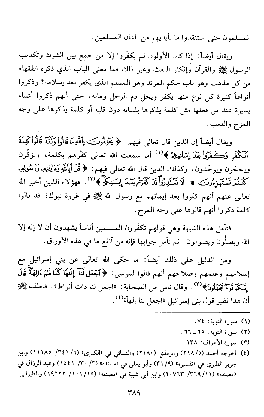ويقال أيضاً إن الذين قال تعالى فيهم: {يَحْلِفُونَ بِاللَّهِ مَا قَالُوا وَلَقَدْ قَالُوا كَلِمَةَ الْكُفْرِ وَكَفَرُوا بَعْدَ إِسْلامِهِمْ} 1 أما سمعت الله تعالى كفّرهم بكلمة، ويزكّون ويحجّون ويوحّدون، وكذلك الذين قال الله تعالى فيهم: {قُلْ أَبِاللَّهِ وَآيَاتِهِ وَرَسُولِهِ كُنْتُمْ تَسْتَهْزِئُونَ * لا تَعْتَذِرُوا قَدْ كَفَرْتُمْ بَعْدَ إِيمَانِكُمْ} 2. فهؤلاء الذين أخبر الله تعالى عنهم أنهم كفروا بعد إيمانهم مع رسول الله صلى الله عليه وسلم في غزوة تبوك؛ قد قالوا كلمة ذكروا أنهم قالوها على وجه المزح.