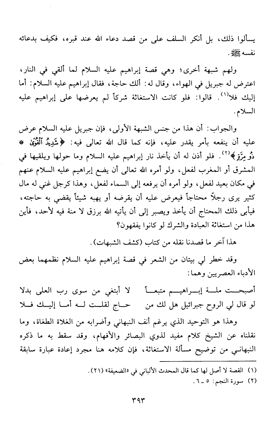 والجواب: أن هذا من جنس الشبهة الأولى، فإن جبريل عليه السلام عرض عليه أن ينفعه بأمر يقدر عليه، فإنه كما قال الله تعالى فيه: {شَدِيدُ الْقُوَى* ذُو مِرَّةٍ} 2. فلو أذن له أن يأخذ نار إبراهيم عليه السلام وما حولها ويلقيها في المشرق أو المغرب لفعل، ولو أمره الله تعالى أن يضع إبراهيم عليه السلام عنهم في مكان بعيد لفعل، ولو أمره أن يرفعه إلى السماء لفعل، وهذا كرجل غني له مال كثير يرى رجلاً محتاجاً فيعرض عليه أن يقرضه أو يهبه شيئاً يقضي به حاجته، فيأبى ذلك المحتاج أن يأخذ ويصبر إلى أن يأتيه الله برزق لا منة فيه لأحد، فأين هذا من استغاثة العبادة والشرك لو كانوا يفقهون؟