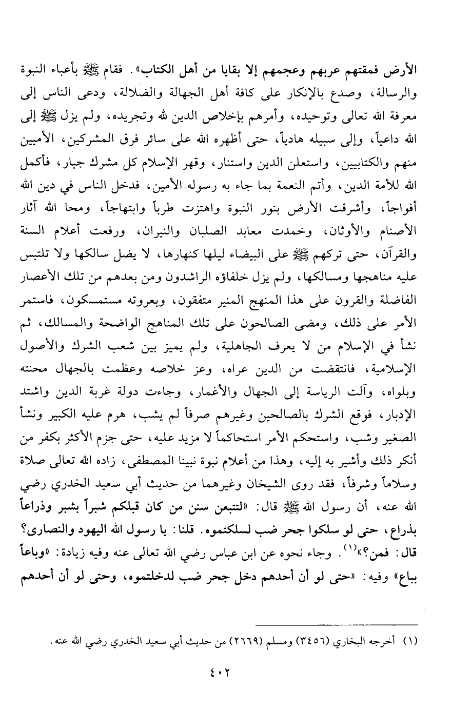 الأرض فمقتهم عربهم وعجمهم إلا بقايا من أهل الكتاب". فقام صلى الله عليه وسلم بأعباء النبوة والرسالة، وصدع بالإنكار على كافة أهل الجهالة والضلالة، ودعى الناس إلى معرفة الله تعالى وتوحيده، وأمرهم بإخلاص الدين لله وتجريده، ولم يزل صلى الله عليه وسلم إلى الله داعياً، وإلى سبيله هادياً، حتى أظهره الله على سائر فرق المشركين، الأميين منهم والكتابيين، واستعلن الدين واستنار، وقهر الإسلام كل مشرك جبار، فأكمل الله للأمة الدين، وأتم النعمة بما جاء به رسوله الأمين، فدخل الناس في دين الله أفواجاً، وأشرقت الأرض بنور النبوة واهتزت طرباً وابتهاجاً، ومحا الله آثار الأصنام والأوثان، وخمدت معابد الصلبان والنيران، ورفعت أعلام السنة والقرآن، حتى تركهم صلى الله عليه وسلم على البيضاء ليلها كنهارها، لا يضل سالكها ولا تلتبس عليه مناهجها ومسالكها، ولم يزل خلفاؤه الراشدون ومن بعدهم من تلك الأعصار الفاضلة والقرون على هذا المنهج المنير متفقون، وبعروته مستمسكون، فاستمر الأمر على ذلك، ومضى الصالحون على تلك المناهج الواضحة والمسالك، ثم نشأ في الإسلام من لا يعرف الجاهلية، ولم يميز بين شعب الشرك والأصول الإسلامية، فانتقضت من الدين عراه، وعز خلاصه وعظمت بالجهال محنته وبلواه، وآلت الرياسة إلى الجهال والأغمار، وجاءت دولة غربة الدين واشتد الإدبار، فوقع الشرك بالصالحين وغيرهم صرفاً لم يشب، هرم عليه الكبير ونشأ الصغير وشب، واستحكم الأمر استحكاماً لا مزيد عليه، حتى جزم الأكثر بكفر من أنكر ذلك وأشير به إليه، وهذا من أعلام نبوة نبينا المصطفى، زاده الله تعالى صلاة وسلاماً وشرفاً، فقد روى الشيخان وغيرهما من حديث أبي سعيد الخدري رضي الله عنه، أن رسول الله صلى الله عليه وسلم قال: "لتتبعن سنن من كان قبلكم شبراً بشبر وذراعاً بذراع، حتى لو سلكوا جحر ضب لسلكتموه. قلنا: يا رسول الله اليهود والنصارى؟ قال: فمن؟ " 1. وجاء نحوه عن ابن عباس رضي الله تعالى عنه وفيه زيادة: "وباعاً بباع" وفيه: "حتى لو أن أحدهم دخل جحر ضب لدخلتموه، وحتى لو أن أحدهم