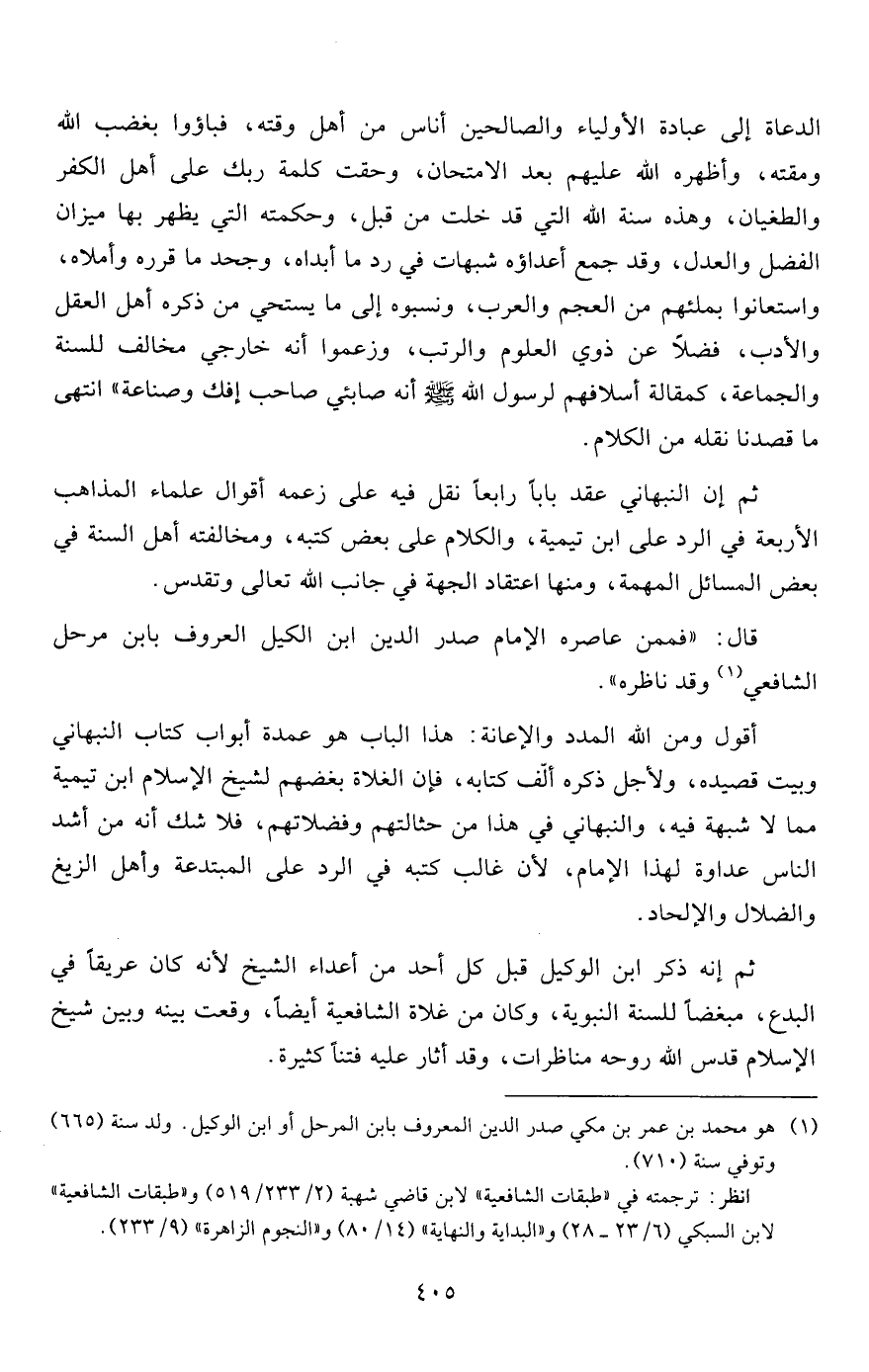 أقول ومن الله المدد والإعانة: هذا الباب هو عمدة أبواب كتاب النبهاني وبيت قصيده، ولأجل ذكره ألّف كتابه، فإن الغلاة بغضهم لشيخ الإسلام ابن تيمية مما لا شبهة فيه، والنبهاني في هذا من حثالتهم وفضلاتهم، فلا شك أنه من أشد الناس عداوة لهذا الإمام، لأن غالب كتبه في الرد على المبتدعة وأهل الزيغ والضلال والإلحاد.