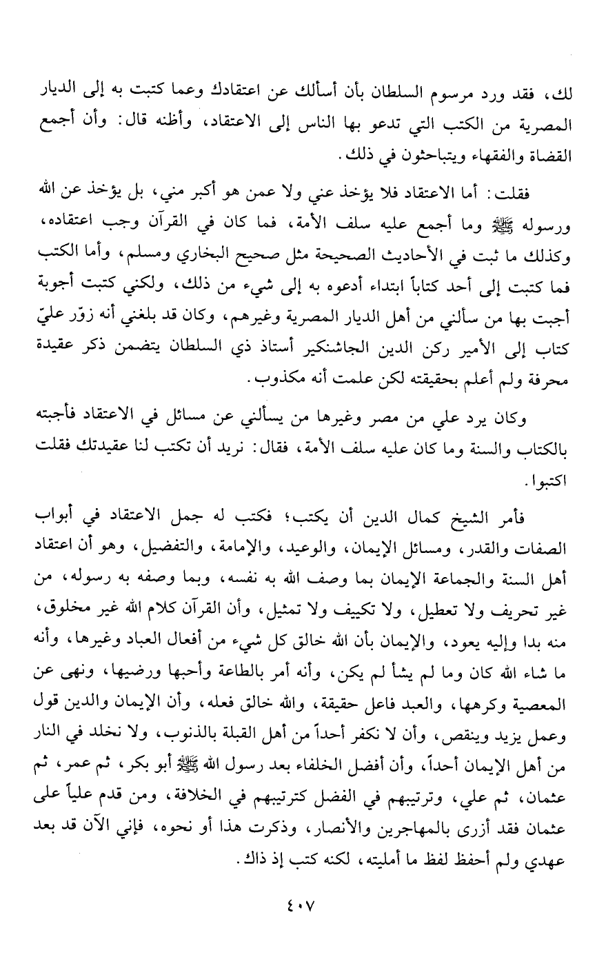 فقلت: أما الاعتقاد فلا يؤخذ عني ولا عمن هو أكبر مني، بل يؤخذ عن الله ورسوله صلى الله عليه وسلم وما أجمع عليه سلف الأمة، فما كان في القرآن وجب اعتقاده، وكذلك ما ثبت في الأحاديث الصحيحة مثل صحيح البخاري ومسلم، وأما الكتب فما كتبت إلى أحد كتاباً ابتداء أدعوه به إلى شيء من ذلك، ولكني كتبت أجوبة أجبت بها من سألني من أهل الديار المصرية وغيرهم، وكان قد بلغني أنه زوّر عليّ كتاب إلى الأمير ركن الدين الجاشنكير أستاذ ذي السلطان يتضمن ذكر عقيدة محرفة ولم أعلم بحقيقته لكن علمت أنه مكذوب.