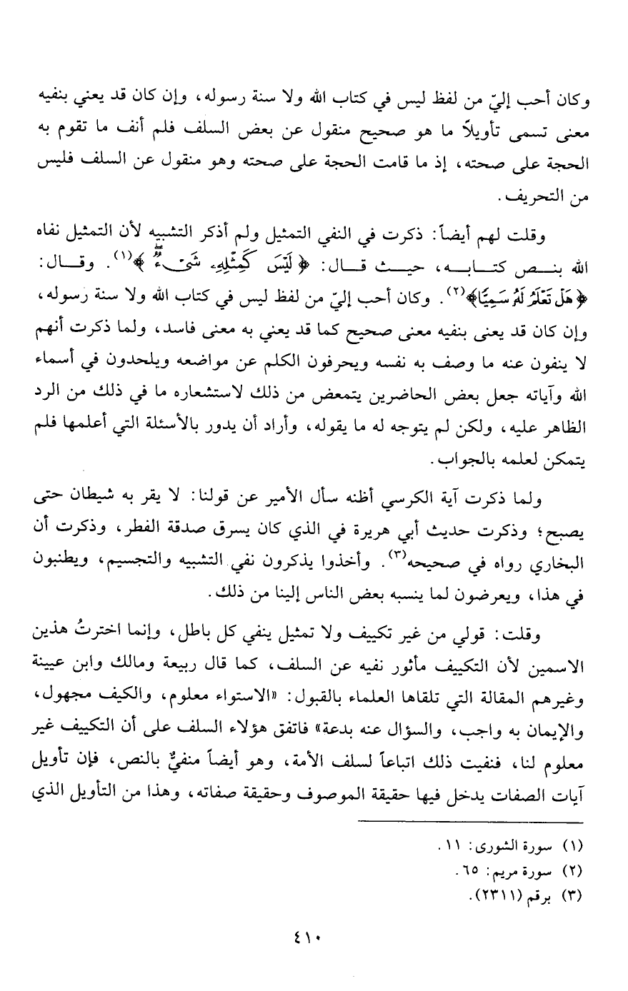وكان أحب إليّ من لفظ ليس في كتاب الله ولا سنة رسوله، وإن كان قد يعني بنفيه معنى تسمى تأويلاً ما هو صحيح منقول عن بعض السلف فلم أنف ما تقوم به الحجة على صحته، إذ ما قامت الحجة على صحته وهو منقول عن السلف فليس من التحريف.