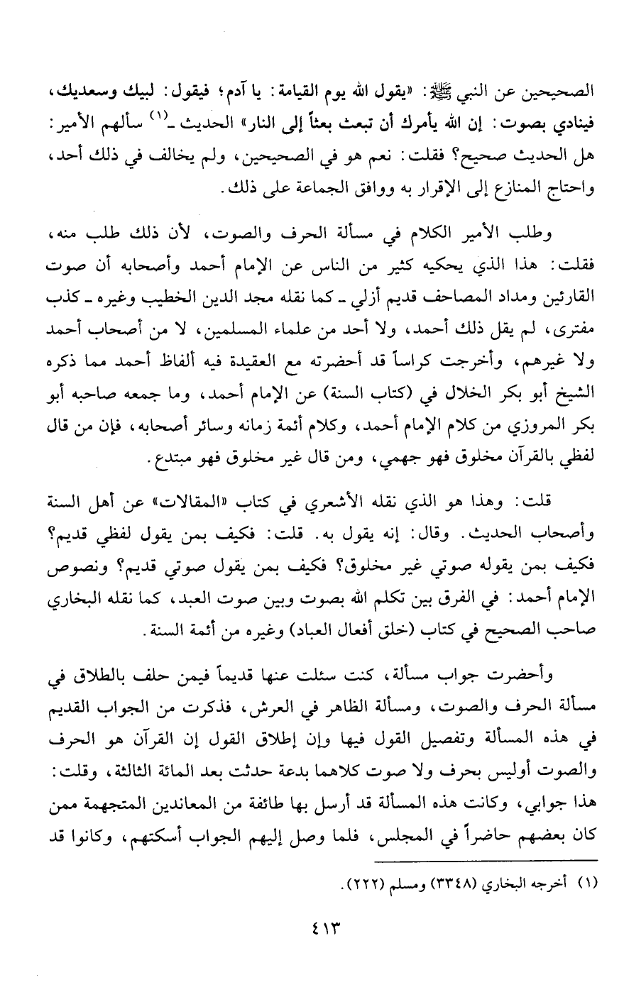 قلت: وهذا هو الذي نقله الأشعري في كتاب "المقالات" عن أهل السنة وأصحاب الحديث. وقال: إنه يقول به. قلت: فكيف بمن يقول لفظي قديم؟ فكيف بمن يقوله صوتي غير مخلوق؟ فكيف بمن يقول صوتي قديم؟ ونصوص الإمام أحمد: في الفرق بين تكلم الله بصوت وبين صوت العبد، كما نقله البخاري صاحب الصحيح في كتاب (خلق أفعال العباد) وغيره من أئمة السنة.