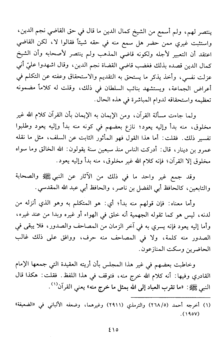 وخاطبت بعضهم في غير هذا المجلس بأن أريته العقيدة التي جمعها الإمام القادري وفيها: أنه كلام الله خرج منه، فتوقف في هذا اللفظ. فقلت: هكذا قال النبي صلى الله عليه وسلم: "ما تقرب العباد إلى الله بمثل ما خرج منه" يعني القرآن1.