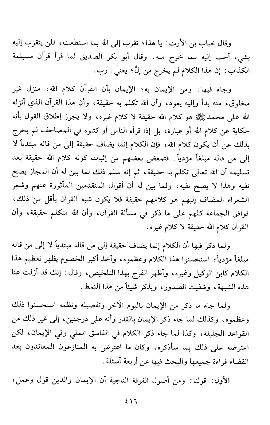 وجاء فيها: ومن الإيمان به؛ الإيمان بأن القرآن كلام الله، منزل غير مخلوق، منه بدأ وإليه يعود، وأن الله تكلم به حقيقة، وأن هذا القرآن الذي أنزله الله على محمد صلى الله عليه وسلم هو كلام الله حقيقة لا كلام غيره، ولا يجوز إطلاق القول بأنه حكاية عن كلام الله أو عبارة، بل إذا قرأه الناس أو كتبوه في المصاحف لم يخرج بذلك عن أن يكون كلام الله، فإن الكلام إنما يضاف حقيقة إلى من قاله مبتدئاً لا إلى من قاله مبلغاً مؤدياً. فتمعض بعضهم من إثبات كونه كلام الله حقيقة بعد تسليمه أن الله تعالى تكلم به حقيقة، ثم إنه سلم ذلك لما بين له أن المجاز يصح نفيه وهذا لا يصح نفيه، ولما بين له أن أقوال المتقدمين المأثورة عنهم وشعر الشعراء المضاف إليهم هو كلامهم حقيقة فلا يكون شبه القرآن بأقل من ذلك، فوافق الجماعة كلهم على ما ذكر في مسألة القرآن، وأن الله متكلم حقيقة، وأن القرآن كلام الله حقيقة لا كلام غيره.