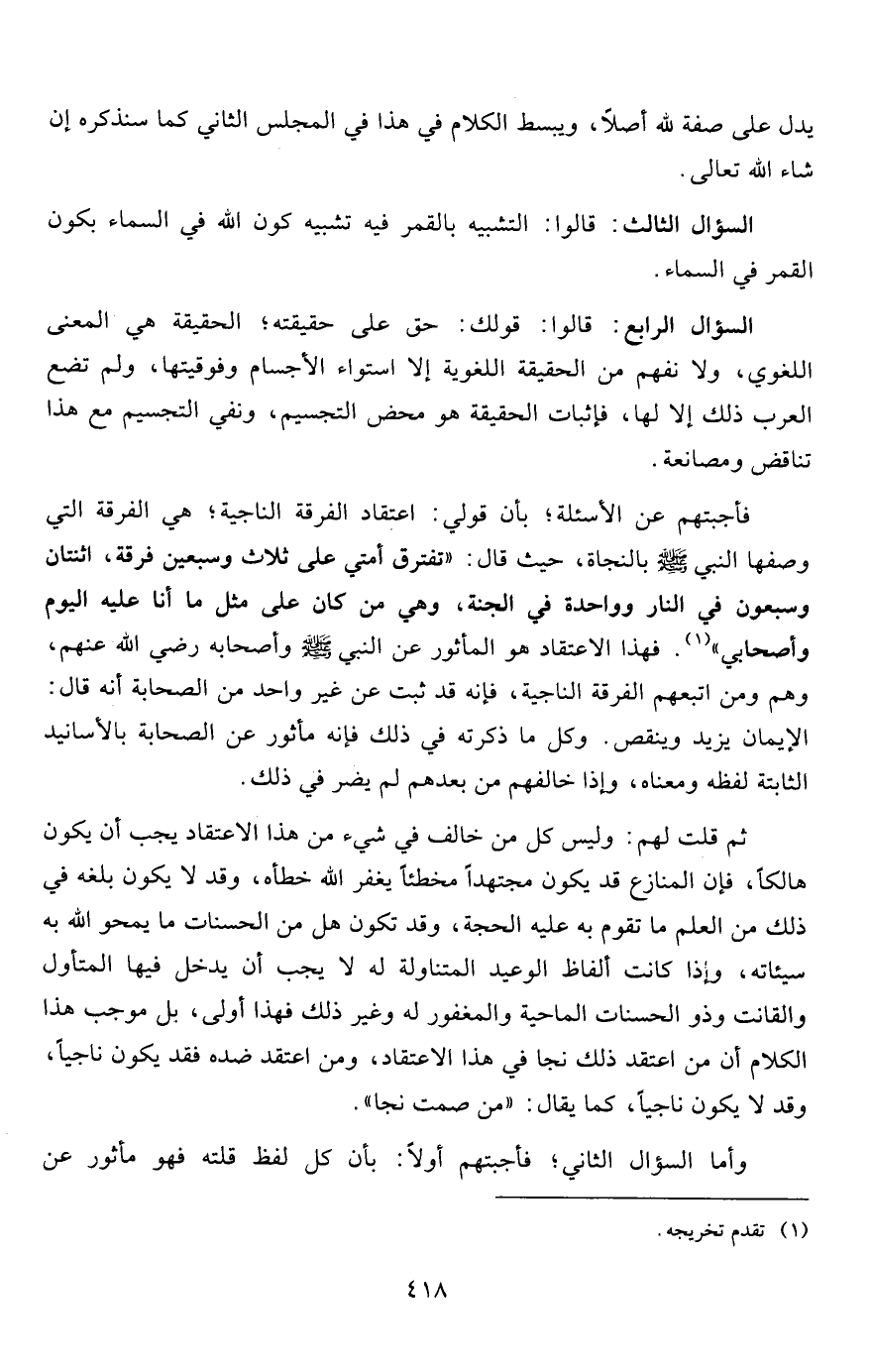 فأجبتهم عن الأسئلة؛ بأن قولي: اعتقاد الفرقة الناجية؛ هي الفرقة التي وصفها النبي صلى الله عليه وسلم بالنجاة، حيث قال: "تفترق أمتي على ثلاث وسبعين فرقة، اثنتان وسبعون في النار وواحدة في الجنة، وهي من كان على مثل ما أنا عليه اليوم وأصحابي" 1. فهذا الاعتقاد هو المأثور عن النبي صلى الله عليه وسلم وأصحابه رضي الله عنهم، وهم ومن اتبعهم الفرقة الناجية، فإنه قد ثبت عن غير واحد من الصحابة أنه قال: الإيمان يزيد وينقص. وكل ما ذكرته في ذلك فإنه مأثور عن الصحابة بالأسانيد الثابتة لفظه ومعناه، وإذا خالفهم من بعدهم لم يضر في ذلك.