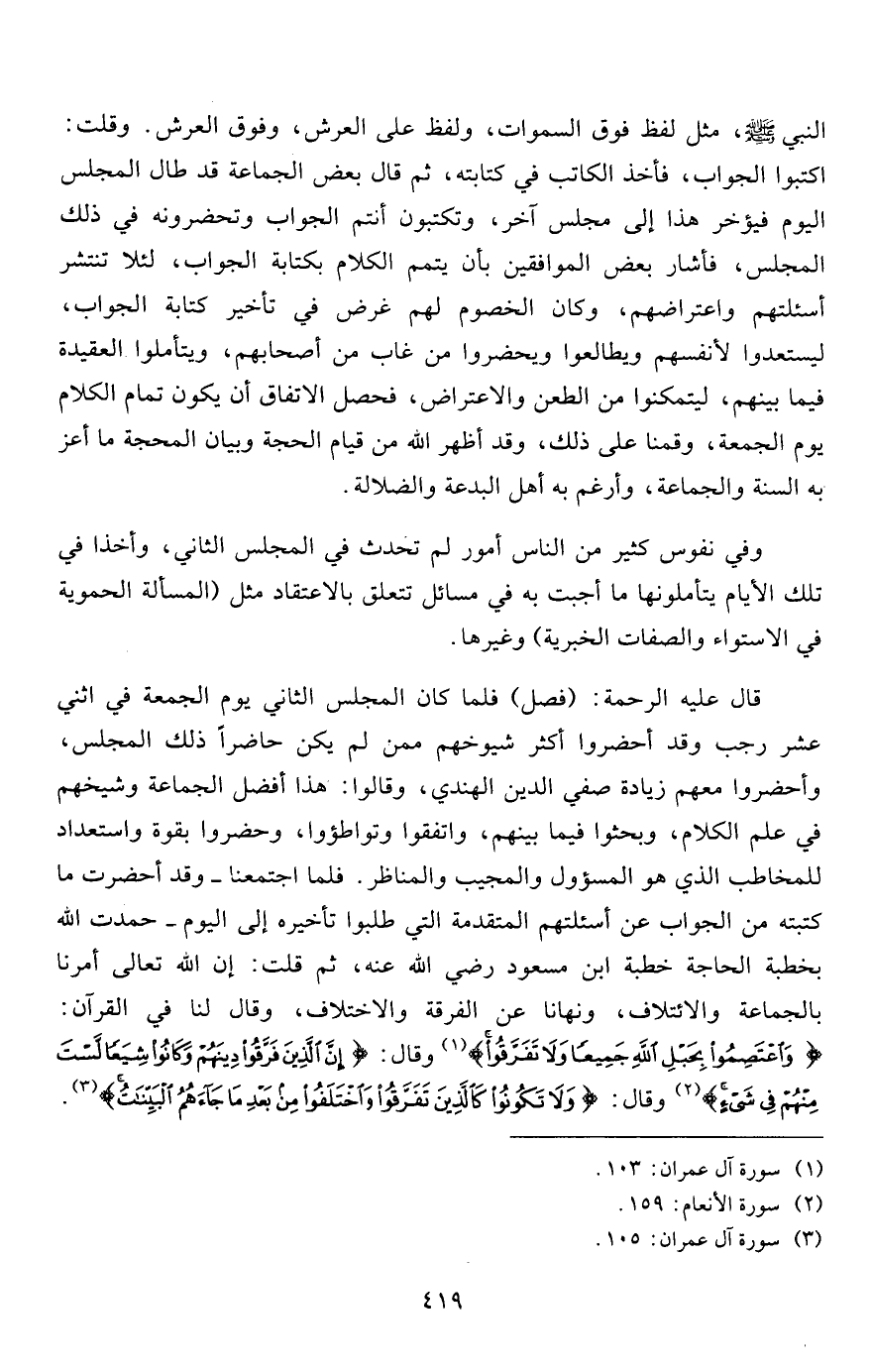 قال عليه الرحمة: (فصل) فلما كان المجلس الثاني يوم الجمعة في اثني عشر رجب وقد أحضروا أكثر شيوخهم ممن لم يكن حاضراً ذلك المجلس، وأحضروا معهم زيادة صفي الدين الهندي، وقالوا: هذا أفضل الجماعة وشيخهم في علم الكلام، وبحثوا فيما بينهم، واتفقوا وتواطؤوا، وحضروا بقوة واستعداد للمخاطب الذي هو المسؤول والمجيب والمناظر. فلما اجتمعنا- وقد أحضرت ما كتبته من الجواب عن أسئلتهم المتقدمة التي طلبوا تأخيره إلى اليوم- حمدت الله بخطبة الحاجة خطبة ابن مسعود رضي الله عنه، ثم قلت: إن الله تعالى أمرنا بالجماعة والائتلاف، ونهانا عن الفرقة والاختلاف، وقال لنا في القرآن: {وَاعْتَصِمُوا بِحَبْلِ اللَّهِ جَمِيعاً وَلا تَفَرَّقُوا} 1 وقال: {إِنَّ الَّذِينَ فَرَّقُوا دِينَهُمْ وَكَانُوا شِيَعاً لَسْتَ مِنْهُمْ فِي شَيْءٍ} 2 وقال: {وَلا تَكُونُوا كَالَّذِينَ تَفَرَّقُوا وَاخْتَلَفُوا مِنْ بَعْدِ مَا جَاءَهُمُ الْبَيِّنَاتُ} 3.