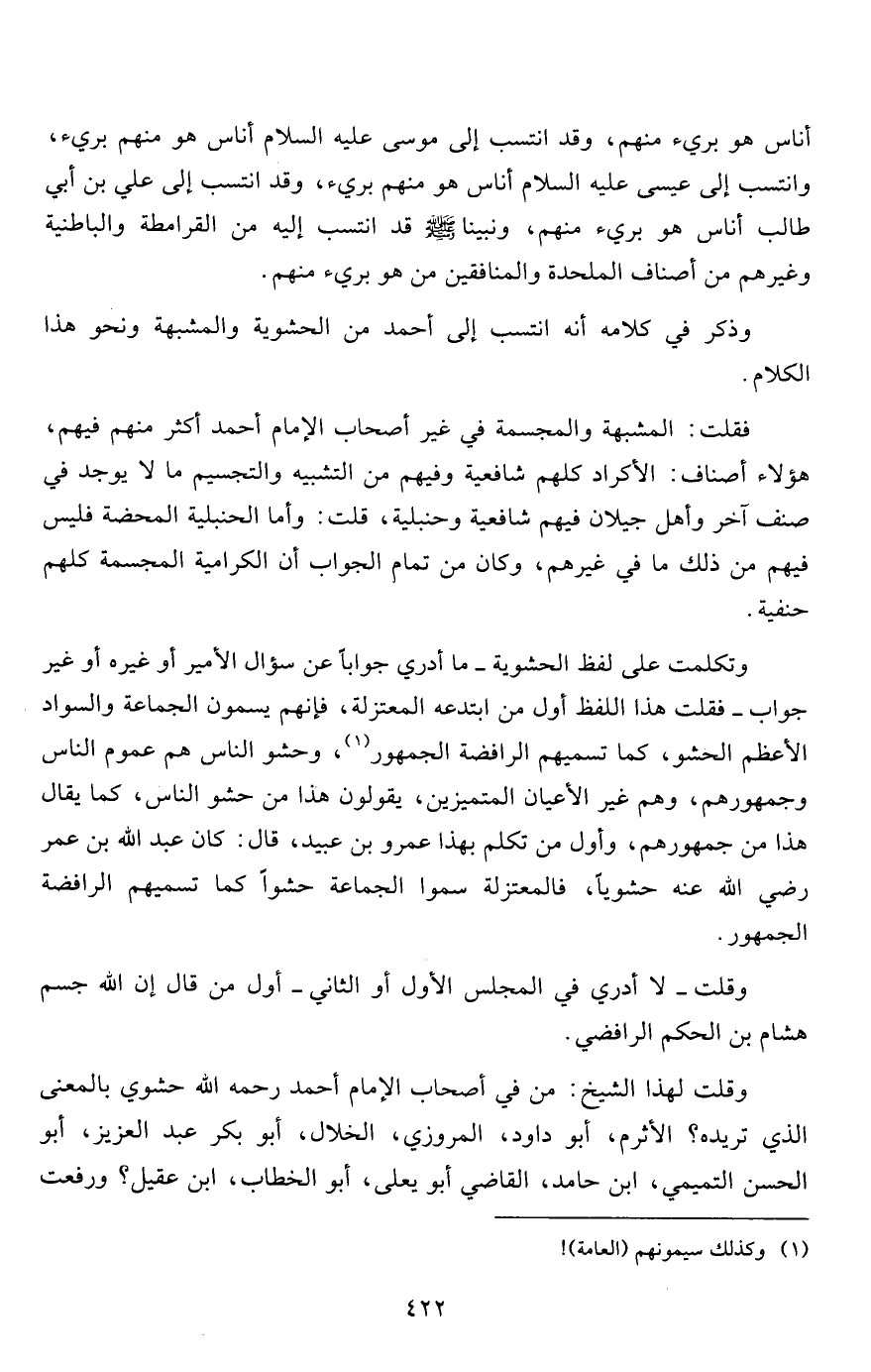 وقلت لهذا الشيخ: من في أصحاب الإمام أحمد رحمه الله حشوي بالمعنى الذي تريده؟ الأثرم، أبو داود، المروزي، الخلال، أبو بكر عبد العزيز، أبو الحسن التميمي، ابن حامد، القاضي أبو يعلى، أبو الخطاب، ابن عقيل؟ ورفعت