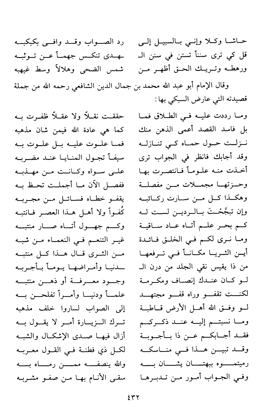 وقال الإمام أبو عبد الله محمد بن جمال الدين الشافعي رحمه الله من جملة قصيدته التي عارض السبكي بها: