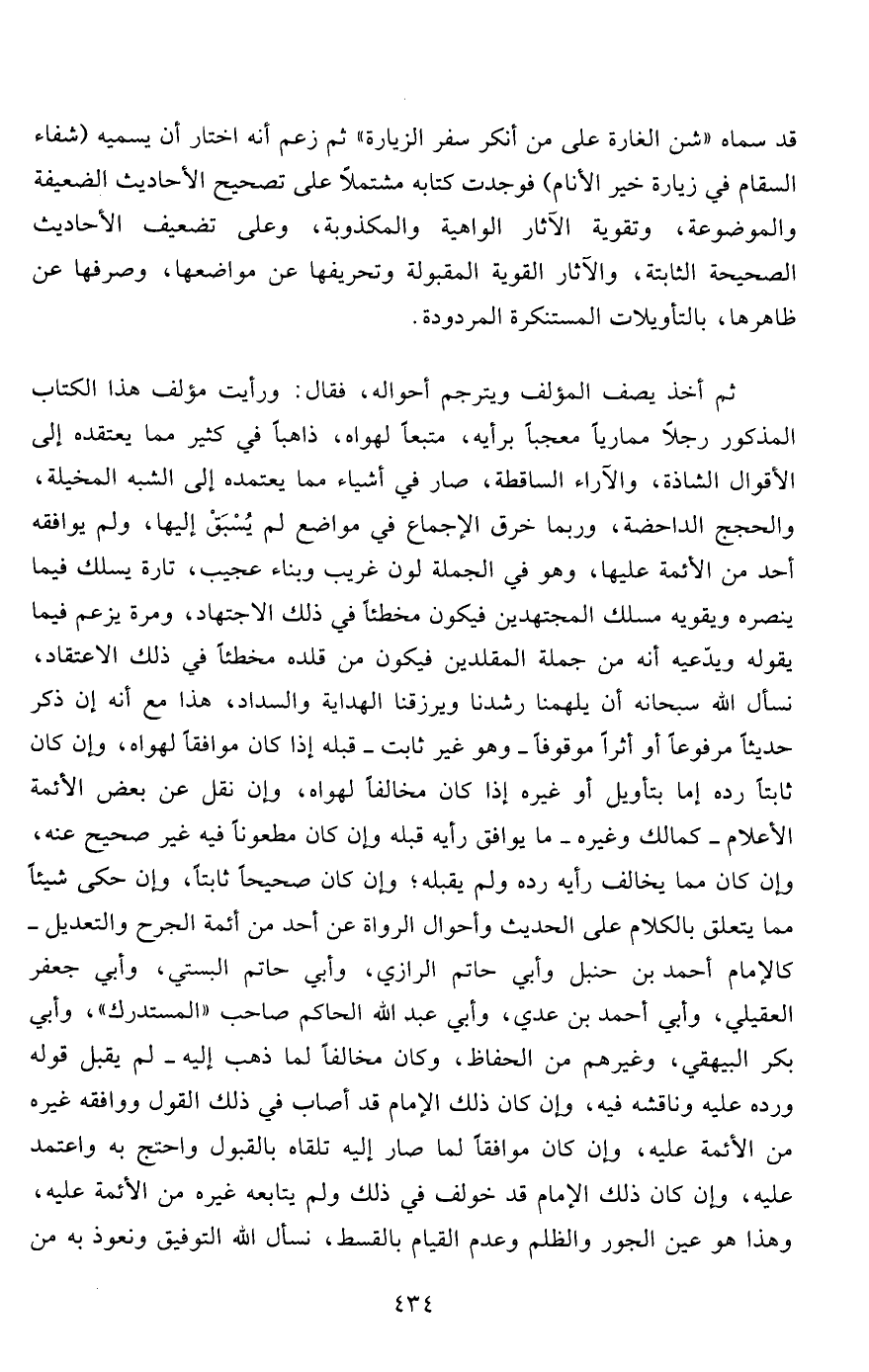 قد سماه "شن الغارة على من أنكر سفر الزيارة" ثم زعم أنه اختار أن يسميه (شفاء السقام في زيارة خير الأنام) فوجدت كتابه مشتملاً على تصحيح الأحاديث الضعيفة والموضوعة، وتقوية الآثار الواهية والمكذوبة، وعلى تضعيف الأحاديث الصحيحة الثابتة، والآثار القوية المقبولة وتحريفها عن مواضعها، وصرفها عن ظاهرها، بالتأويلات المستنكرة المردودة.