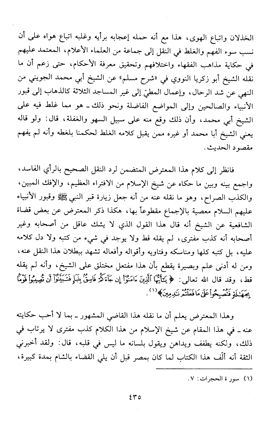 فانظر إلى كلام هذا المعترض المتضمن لرد النقل الصحيح بالرأي الفاسد، واجمع بينه وبين ما حكاه عن شيخ الإسلام من الافتراء العظيم، والإفك المبين، والكذب الصراح، وهو ما نقله عنه من أنه جعل زيارة قبر النبي صلى الله عليه وسلم وقبور الأنبياء عليهم السلام معصية بالإجماع مقطوعاً بها، هكذا ذكر المعترض عن بعض قضاة الشافعية عن الشيخ أنه قال هذا القول الذي لا يشك عاقل من أصحابه وغير أصحابه أنه كذب مفترى، لم يقله قط ولا يوجد في شيء من كتبه ولا دل كلامه عليه، بل كتبه كلها ومناسكه وفتاويه وأقواله وأفعاله تشهد ببطلان هذا النقل عنه، ومن له أدنى علم وبصيرة يقطع بأن هذا مفتعل مختلق على الشيخ، وأنه لم يقله قط، وقد قال الله تعالى: {يَا أَيُّهَا الَّذِينَ آمَنُوا إِنْ جَاءَكُمْ فَاسِقٌ بِنَبَأٍ فَتَبَيَّنُوا أَنْ تُصِيبُوا قَوْماً بِجَهَالَةٍ فَتُصْبِحُوا عَلَى مَا فَعَلْتُمْ نَادِمِينَ} 1.