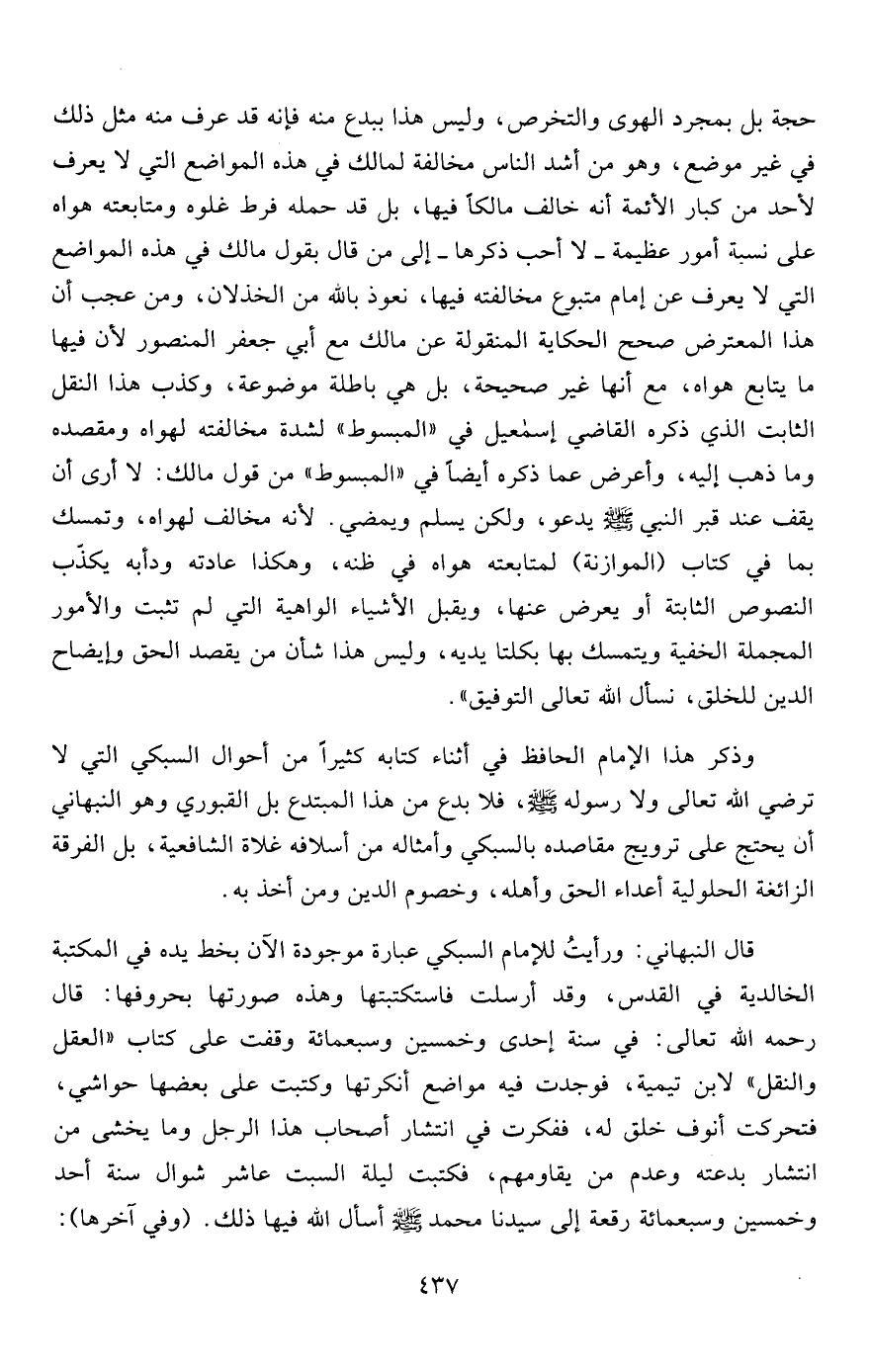وذكر هذا الإمام الحافظ في أثناء كتابه كثيراً من أحوال السبكي التي لا ترضي الله تعالى ولا رسوله صلى الله عليه وسلم، فلا بدع من هذا المبتدع بل القبوري وهو النبهاني أن يحتج على ترويج مقاصده بالسبكي وأمثاله من أسلافه غلاة الشافعية، بل الفرقة الزائغة الحلولية أعداء الحق وأهله، وخصوم الدين ومن أخذ به.