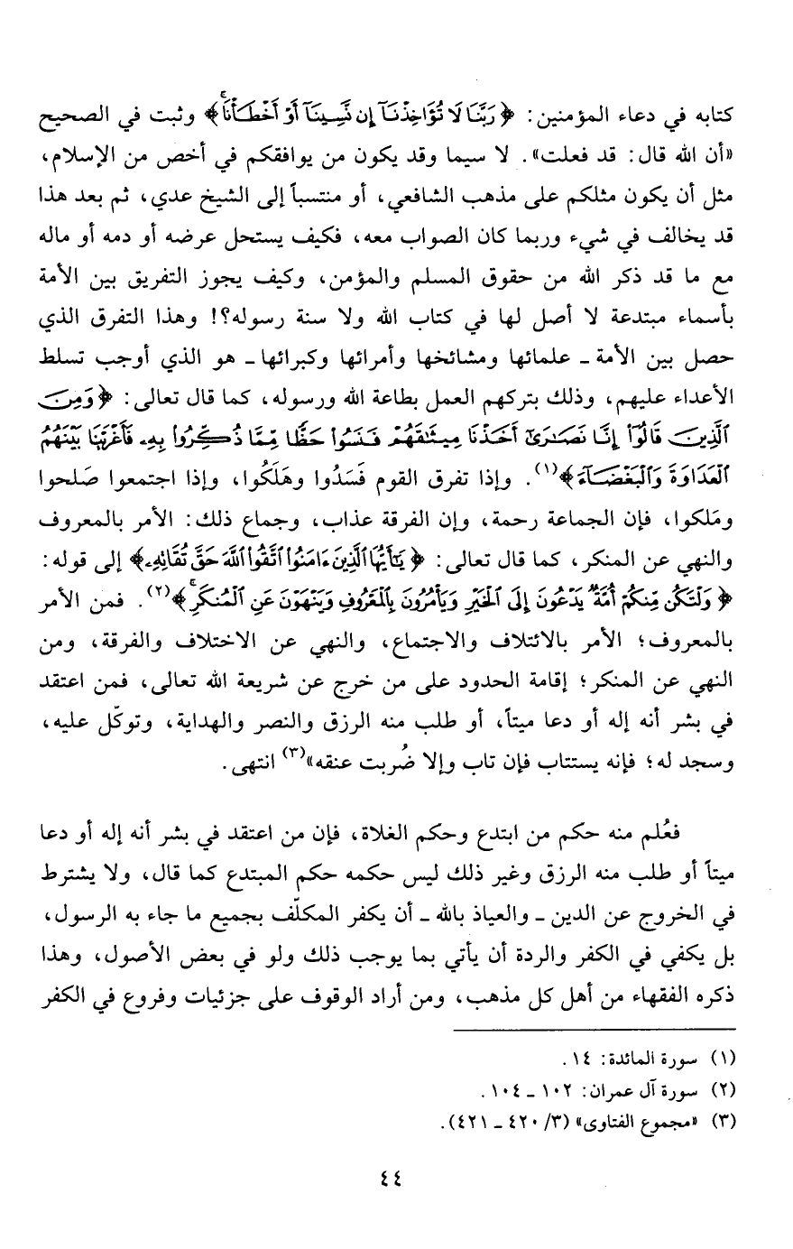 كتابه في دعاء المؤمنين: {رَبَّنَا لا تُؤَاخِذْنَا إِنْ نَسِينَا أَوْ أَخْطَأْنَا} وثبت في الصحيح "أن الله قال: قد فعلت". لاسيما وقد يكون من يوافقكم في أخص من الإسلام، مثل أن يكون مثلكم على مذهب الشافعي، أو منتسباً إلى الشيخ عدي، ثم بعد هذا قد يخالف في شيء وربما كان الصواب معه، فكيف يستحل عرضه أو دمه أو ماله مع ما قد ذكر الله من حقوق المسلم والمؤمن، وكيف يجوز التفريق بين الأمة بأسماء مبتدعة لا أصل لها في كتاب الله ولا سنة رسوله؟! وهذا التفرق الذي حصل بين الأمة- علمائها ومشائخها وأمرائها وكبرائها- هو الذي أوجب تسلط الأعداء عليهم، وذلك بتركهم العمل بطاعة الله ورسوله، كما قال تعالى: {وَمِنَ الَّذِينَ قَالُوا إِنَّا نَصَارَى أَخَذْنَا مِيثَاقَهُمْ فَنَسُوا حَظّاً مِمَّا ذُكِّرُوا بِهِ فَأَغْرَيْنَا بَيْنَهُمُ الْعَدَاوَةَ وَالْبَغْضَاءَ إِلَى يَوْمِ الْقِيَامَةِ وَسَوْفَ يُنَبِّئُهُمُ اللَّهُ بِمَا كَانُوا يَصْنَعُونَ} 1. وإذا تفرق القوم فسدوا وهلكوا، وإذا اجتمعوا صلحوا وملكوا، فإن الجماعة رحمة، ديان الفرقة عذاب، وجماع ذلك: الأمر بالمعروف والنهي عن المنكر، كما قال تعالى: {يَا أَيُّهَا الَّذِينَ آمَنُوا اتَّقُوا اللَّهَ حَقَّ تُقَاتِهِ} إلى قوله: {وَلْتَكُنْ مِنْكُمْ أُمَّةٌ يَدْعُونَ إِلَى الْخَيْرِ وَيَأْمُرُونَ بِالْمَعْرُوفِ وَيَنْهَوْنَ عَنِ الْمُنْكَرِ} 2. فمن الأمر بالمعروف؛ الأمر بالائتلاف والاجتماع، والنهي عن الاختلاف والفرقة، ومن النهي عن المنكر؛ إقامة الحدود على من خرج عن شريعة الله تعالى، فمن اعتقد في بشر أنه إله أو دعا ميتاً، أو طلب منه الرزق والنصر والهداية، وتوكّل عليه، وسجد له؛ فإنه يستتاب فإن تاب وإلاّ ضُربت عنقه"3 انتهى.