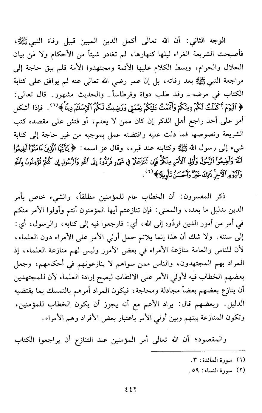 الوجه الثاني: أن الله تعالى أكمل الدين المبين قبيل وفاة النبي صلى الله عليه وسلم، فأصبحت الشريعة الغراء ليلها كنهارها، لم تغادر شيئاً من الأحكام ولا من بيان الحلال والحرام، وبسط الكلام عليها الأئمة ومجتهدوا الأمة فلم يبق حاجة إلى مراجعة النبي صلى الله عليه وسلم بعد وفاته، بل إن عمر رضي الله تعالى عنه لم يوافق على كتابة الكتاب في مرضه- وقد طلب دواة وقرطاساً- والحديث مشهور. قال تعالى: {الْيَوْمَ أَكْمَلْتُ لَكُمْ دِينَكُمْ وَأَتْمَمْتُ عَلَيْكُمْ نِعْمَتِي وَرَضِيتُ لَكُمُ الْأِسْلامَ دِيناً} 1. فإذا أشكل أمر على أحد راجع أهل الذكر إن كان ممن لا يعلم، أو فتش على مقصده كتب الشريعة ونصوصها فما دلت عليه واقتضته عمل بموجبه من غير حاجة إلى كتابة شيء إلى رسول الله صلى الله عليه وسلم وكتابته عند قبره، وقال عز اسمه: {يَا أَيُّهَا الَّذِينَ آمَنُوا أَطِيعُوا اللَّهَ وَأَطِيعُوا الرَّسُولَ وَأُولِي الْأَمْرِ مِنْكُمْ فَإِنْ تَنَازَعْتُمْ فِي شَيْءٍ فَرُدُّوهُ إِلَى اللَّهِ وَالرَّسُولِ إِنْ كُنْتُمْ تُؤْمِنُونَ بِاللَّهِ وَالْيَوْمِ الْآخِرِ ذَلِكَ خَيْرٌ وَأَحْسَنُ تَأْوِيلاً} 2.