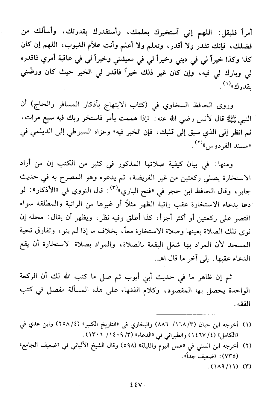 ومنها: في بيان كيفية صلاتها المذكور في كثير من الكتب إن من أراد الاستخارة يصلي ركعتين من غير الفريضة، ثم يدعوه وهو المصرح به في حديث جابر، وقال الحافظ ابن حجر في، "فتح الباري"3: قال النووي في "الأذكار": لو دعا بدعاء الاستخارة عقب راتبة الظهر مثلاً أو غيرها من الراتبة والمطلقة سواء اقتصر على ركعتين أو أكثر أجزأ، كذا أطلق وفيه نظر، ويظهر أن يقال: محله إن نوى تلك الصلاة بعينها وصلاة الاستخارة معاً، بخلاف ما إذا لم ينو، وتفارق تحية المسجد لأن المراد بها شغل البقعة بالصلاة، والمراد بصلاة الاستخارة أن يقع الدعاء عقبها. إلى آخرها قال اهـ.