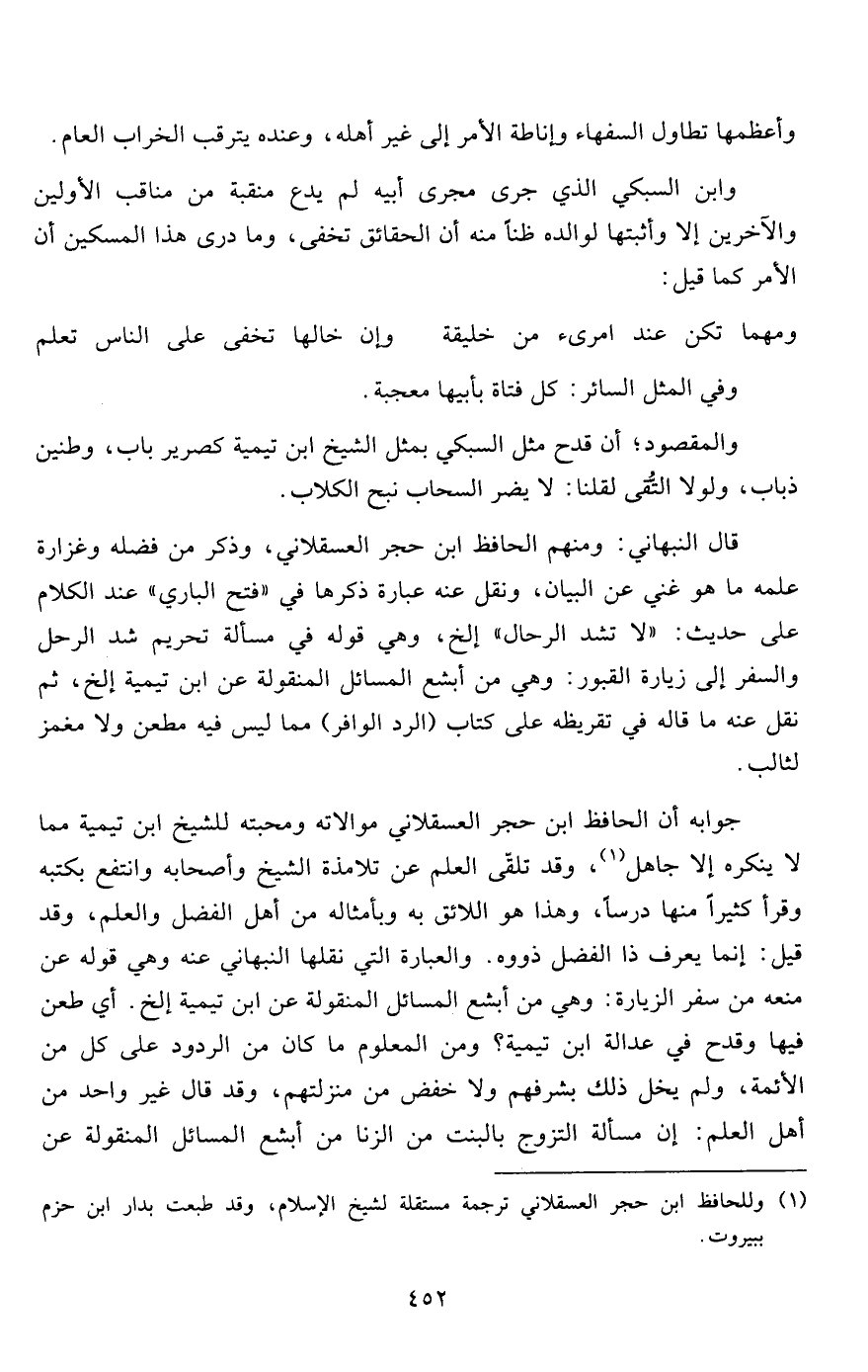 قال النبهاني: ومنهم الحافظ ابن حجر العسقلاني، وذكر من فضله وغزارة علمه ما هو غني عن البيان، ونقل عنه عبارة ذكرها في "فتح الباري" عند الكلام على حديث: "لا تشد الرحال" إلخ، وهي قوله في مسألة تحريم شد الرحل والسفر إلى زيارة القبور: وهي من أبشع المسائل المنقولة عن ابن تيمية إلخ، ثم نقل عنه ما قاله في تقريظه على كتاب (الرد الوافر) مما ليس فيه مطعن ولا مغمز لثالب.