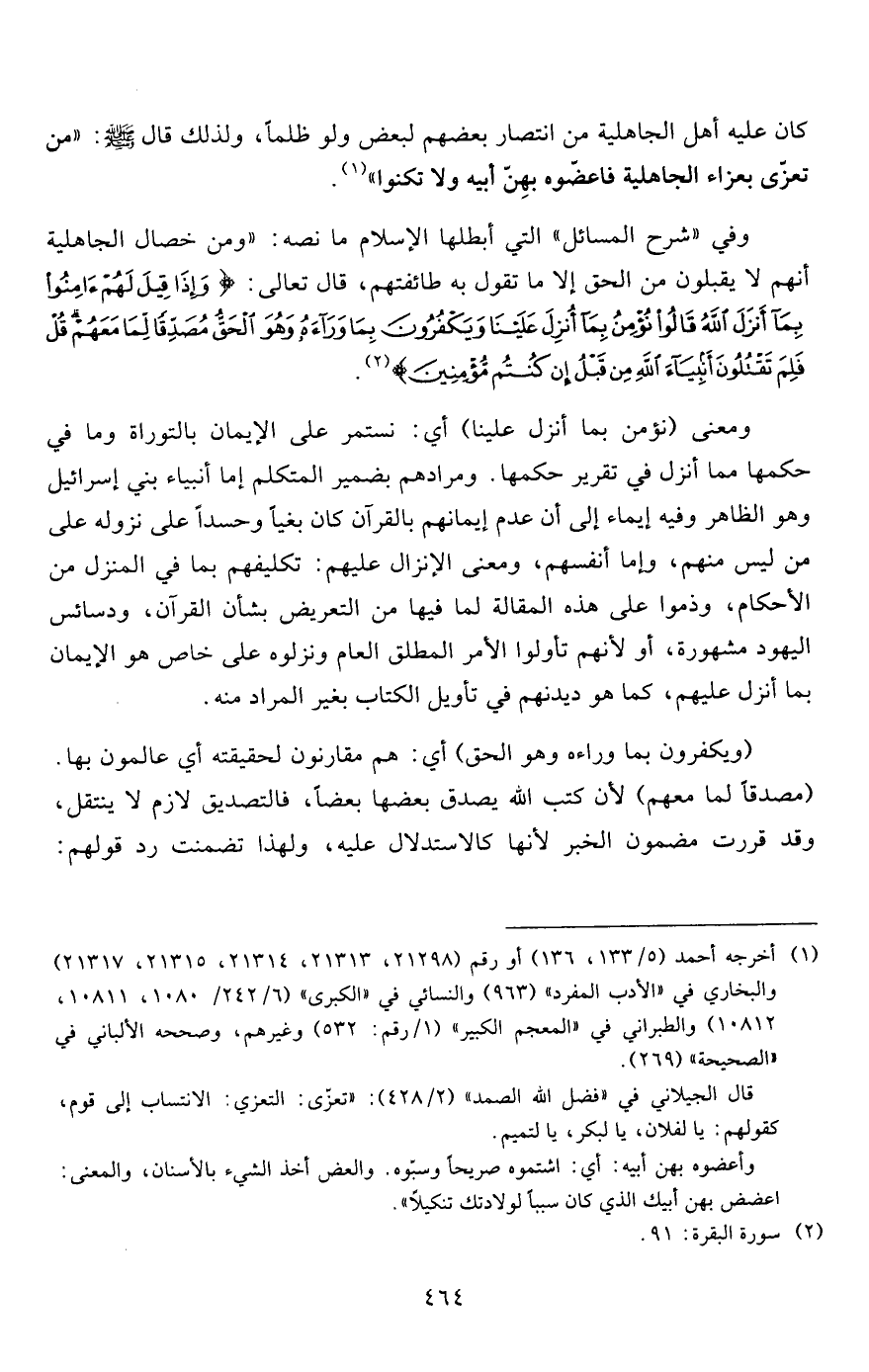 وفي "شرح المسائل" التي أبطلها الإسلام ما نصه: "ومن خصال الجاهلية أنهم لا يقبلون من الحق إلا ما تقول به طائفتهم، قال تعالى: {وَإِذَا قِيلَ لَهُمْ آمِنُوا بِمَا أَنْزَلَ اللَّهُ قَالُوا نُؤْمِنُ بِمَا أُنْزِلَ عَلَيْنَا وَيَكْفُرُونَ بِمَا وَرَاءَهُ وَهُوَ الْحَقُّ مُصَدِّقاً لِمَا مَعَهُمْ قُلْ فَلِمَ تَقْتُلُونَ أَنْبِيَاءَ اللَّهِ مِنْ قَبْلُ إِنْ كُنْتُمْ مُؤْمِنِينَ} 2.