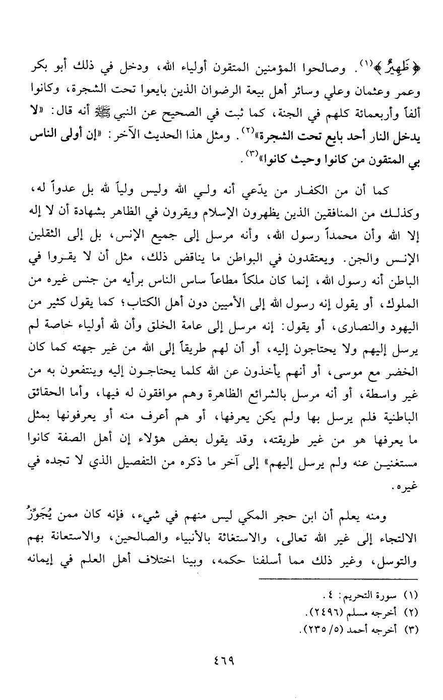 ومنه يعلم أن ابن حجر المكي ليس منهم في شيء، فإنه كان ممن يُجَوِّزُ الالتجاء إلى غير الله تعالى، والاستغاثة بالأنبياء والصالحين، والاستعانة بهم والتوسل، وغير ذلك مما أسلفنا حكمه، وبينا اختلاف أهل العلم في إيمانه