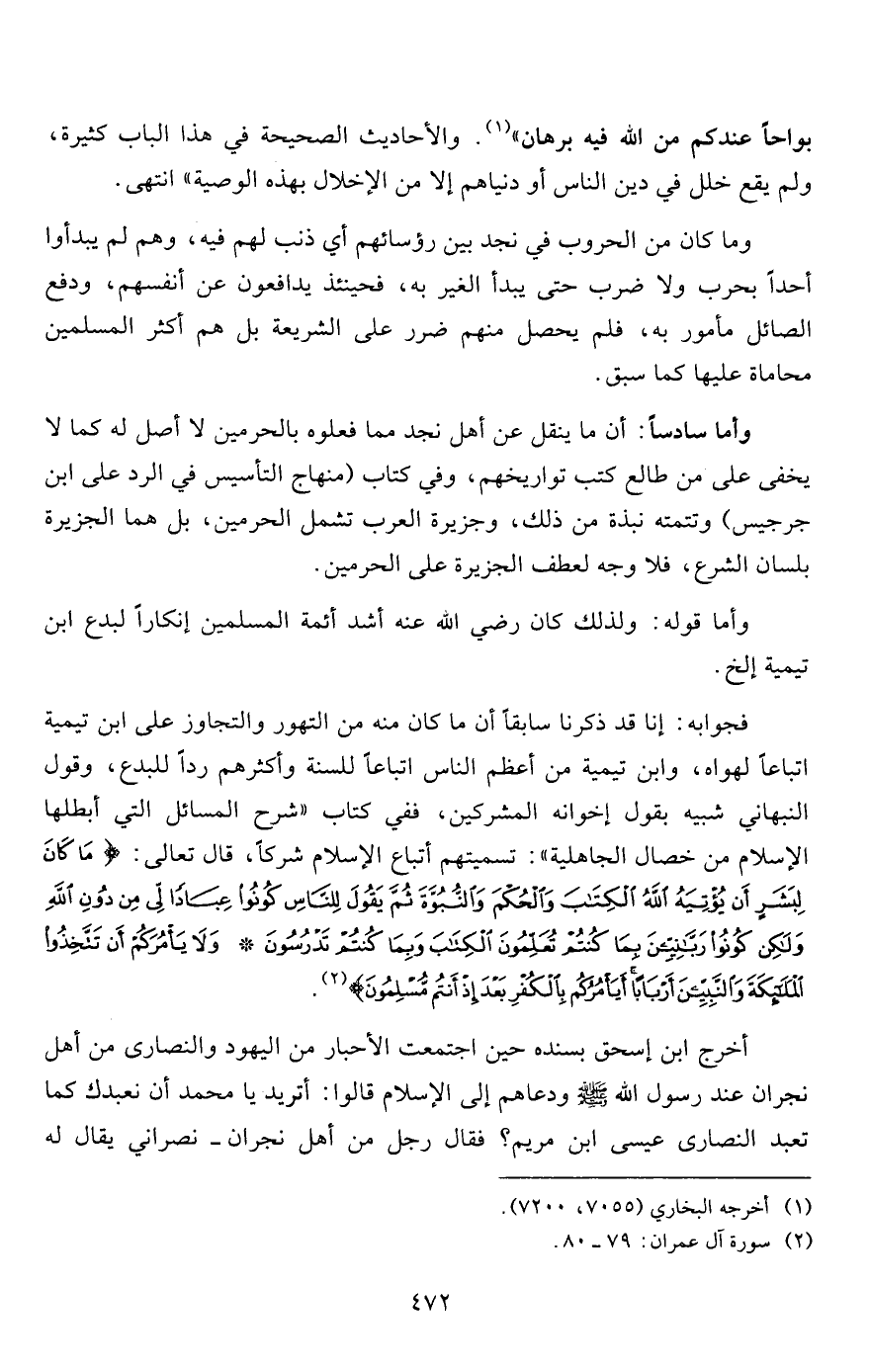 وأما سادساً: أن ما ينقل عن أهل نجد مما فعلوه بالحرمين لا أصل له كما لا يخفى على من طالع كتب تواريخهم، وفي كتاب (منهاج التأسيس في الرد على ابن جرجيس) وتتمته نبذة من ذلك، وجزيرة العرب تشمل الحرمين، بل هما الجزيرة بلسان الشرع، فلا وجه لعطف الجزيرة على الحرمين.