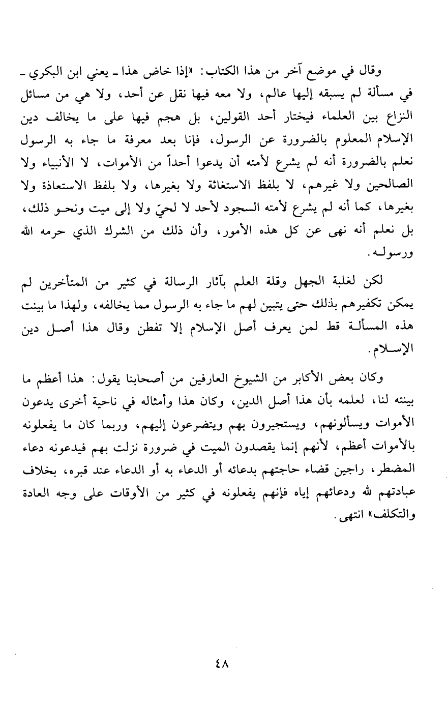 وقال في موضع آخر من هذا الكتاب: "إذا خاض هذا- يعني ابن البكري- في مسألة لم يسبقه إليها عالم، ولا معه فيها نقل عن أحد، ولا هي من مسائل النزاع بين العلماء فيختار أحد القولين، بل هجم فيها على ما يخالف دين الإسلام المعلوم بالضرورة عن الرسول، فإنا بعد معرفة ما جاء به الرسول نعلم بالضرورة أنه لم يشرع لأمته أن يدعوا أحداً من الأموات، لا الأنبياء، ولا الصالحين ولا غيرهم، لا بلفظ الاستغاثة ولا بغيرها، ولا بلفظ الاستعاذة ولا بغيرها، كما أنه لم يشرع لأمته السجود لأحد لا لحيّ ولا إلى ميت ونحو ذلك، بل نعلم أنه نهى عن كل هذه الأمور، وأن ذلك من الشرك الذي حرمه الله ورسوله.