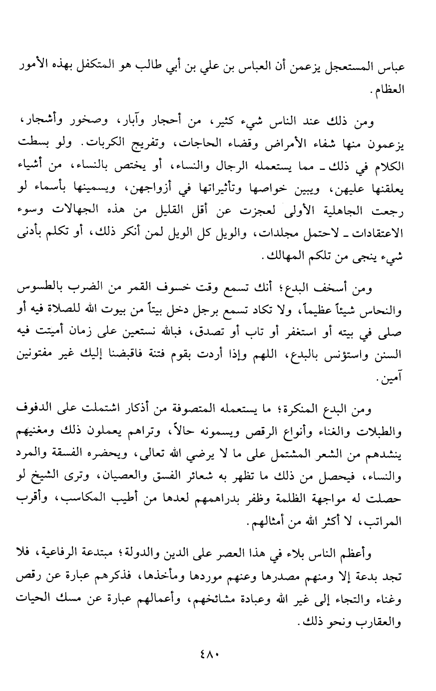 ومن ذلك عند الناس شيء كثير، من أحجار وآبار، وصخور وأشجار، يزعمون منها شفاء الأمراض وقضاء الحاجات، وتفريج الكربات. ولو بسطت الكلام في ذلك- مما يستعمله الرجال والنساء، أو يختص بالنساء، من أشياء يعلقنها عليهن، ويبين خواصها وتأثيراتها في أزواجهن، ويسمينها بأسماء لو رجعت الجاهلية الأولى لعجزت عن أقل القليل من هذه الجهالات وسوء الاعتقادات- لاحتمل مجلدات، والويل كل الويل لمن أنكر ذلك، أو تكلم بأدنى شيء ينجى من تلكم المهالك.