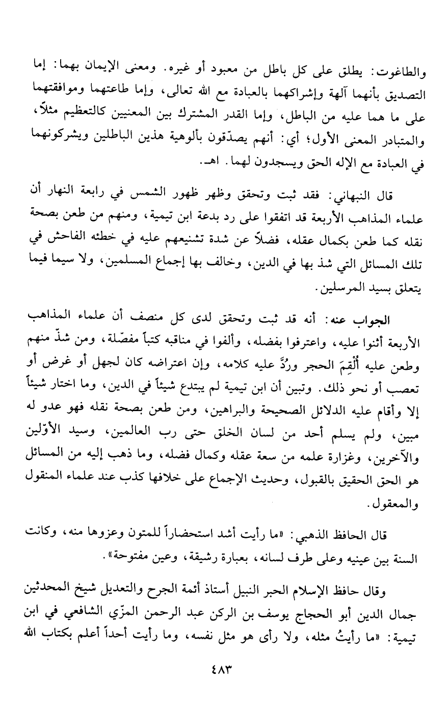 قال النبهاني: فقد ثبت وتحقق وظهر ظهور الشمس في رابعة النهار أن علماء المذاهب الأربعة قد اتفقوا على رد بدعة ابن تيمية، ومنهم من طعن بصحة نقله كما طعن بكمال عقله، فضلاً عن شدة تشنيعهم عليه في خطئه الفاحش في تلك المسائل التي شذ بها في الدين، وخالف بها إجماع المسلمين، ولاسيما فيما يتعلق بسيد المرسلين.