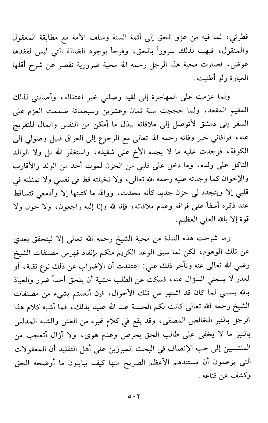 فطرتي، لما فيه من عزو الحق إلى أئمة السنة وسلف الأمة مع مطابقة المعقول والمنقول، فبهت لذلك سروراً بالحق، وفرحاً بوجود الضالة التي ليس لفقدها عوض، فصارت محبة هذا الرجل رحمه الله محبة ضرورية تقصر عن شرح أقلها العبارة ولو أطنبت.