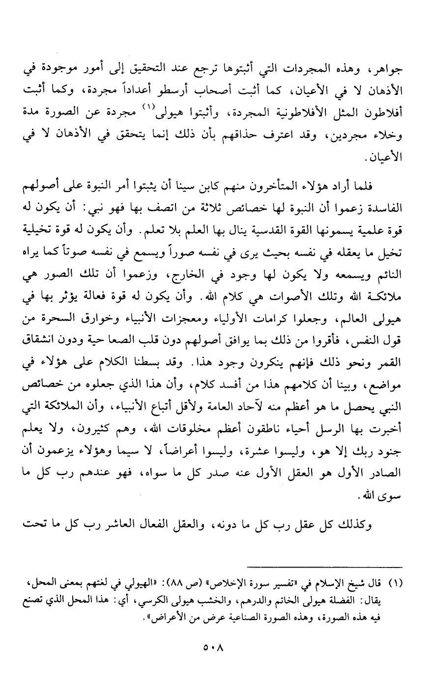 جواهر، وهذه المجردات التي أثبتوها ترجع عند التحقيق إلى أمور موجودة في الأذهان لا في الأعيان، كما أثبت أصحاب أرسطو أعداداً مجردة، وكما أثبت أفلاطون المثل الأفلاطونية المجردة، وأثبتوا هيولى1 مجردة عن الصورة مدة وخلاء مجردين، وقد اعترف حذاقهم بأن ذلك إنما يتحقق في الأذهان لا في الأعيان.