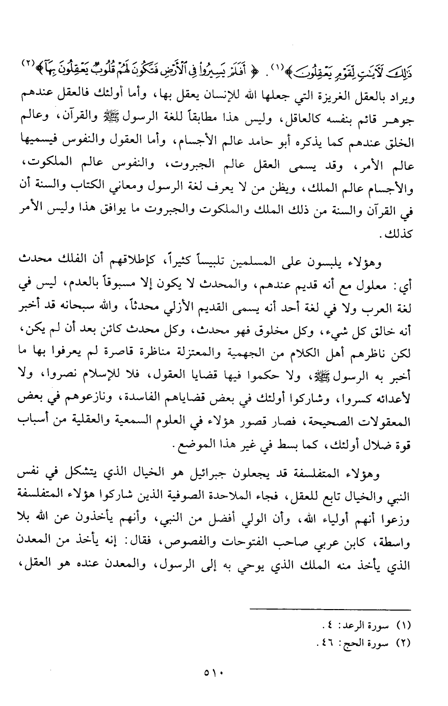 ذَلِكَ لَآياتٍ لِقَوْمٍ يَعْقِلُونَ} 1. {أَفَلَمْ يَسِيرُوا فِي الْأَرْضِ فَتَكُونَ لَهُمْ قُلُوبٌ يَعْقِلُونَ بِهَا} 2 ويراد بالعقل الغريزة التي جعلها الله للإنسان يعقل بها، وأما أولئك فالعقل عندهم جوهر قائم بنفسه كالعاقل، وليس هذا مطابقاً للغة الرسول صلى الله عليه وسلم والقرآن، وعالم الخلق عندهم كما يذكره أبو حامد عالم الأجسام، وأما العقول والنفوس فيسميها عالم الأمر، وقد يسمى العقل عالم الجبروت، والنفوس عالم الملكوت، والأجسام عالم الملك، ويظن من لا يعرف لغة الرسول ومعاني الكتاب والسنة أن في القرآن والسنة من ذلك الملك والملكوت والجبروت ما يوافق هذا وليس الأمر كذلك.